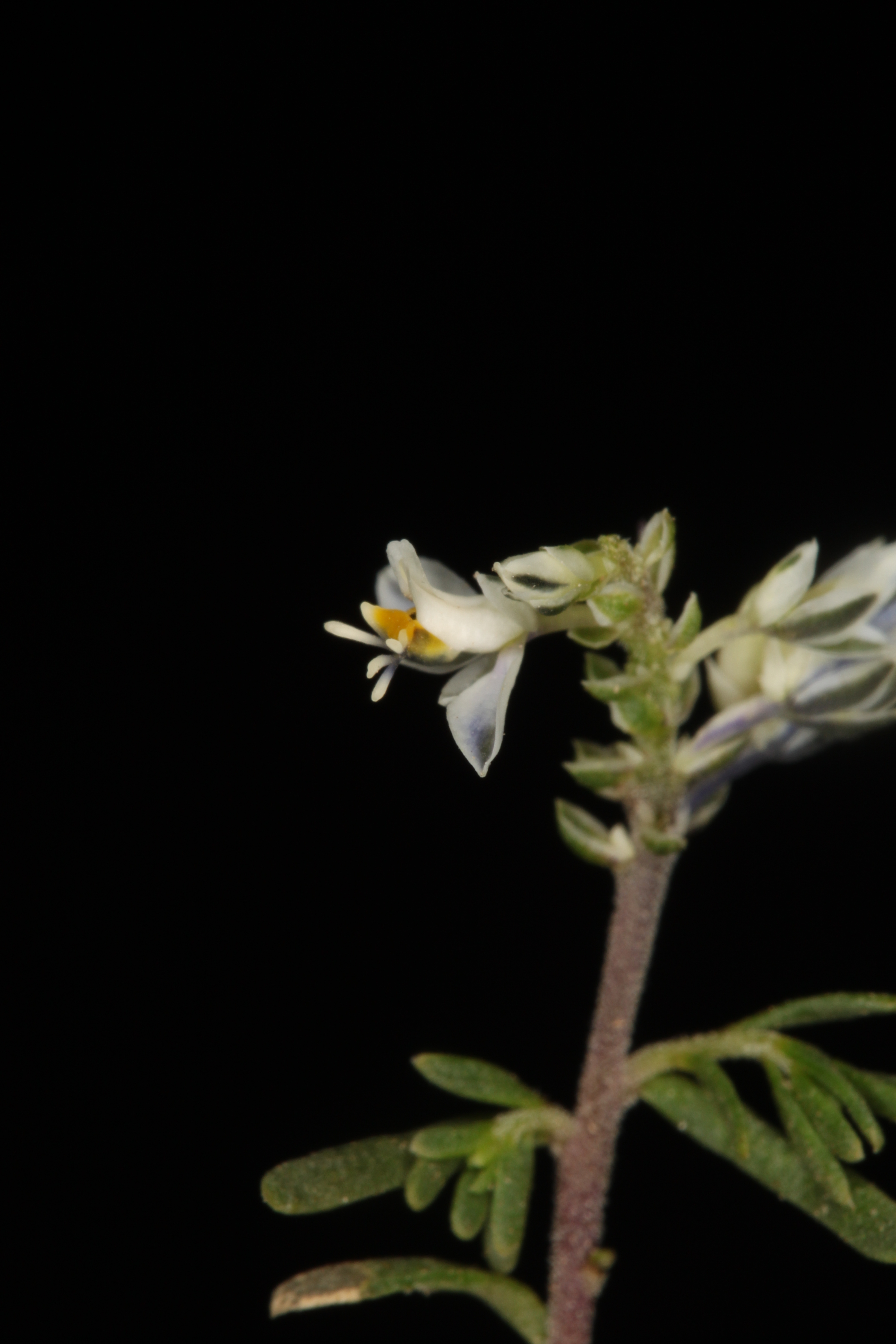 Hierbas de 5-50 cm de alto, erectas a decumbentes, a veces formando matas apoyantes; tallos ramificados desde la base o en la porción media, pubescentes o glabros. Hojas alterno-espiraladas, sésiles; láminas filiformes, lineares u oblongas, de 2-15 × 0,5-1 mm, ápice apiculado, glabras o pubescentes. Inflorescencias en racimos capituliformes a alargados, de 1-1,5 × 0,7-1 cm, congestos; brácteas subelípticas, de 1-3,5 × 0,5-0,9 mm, ápice agudo, nunca más de dos veces más largas que las bractéolas, generalmente glabras, caducas o persistentes en la antesis; bractéolas ovadas, de 0,5-1,5 × 0,5-1 mm, ápice agudo, glabras, caducas o persistentes. Flores de 5,5-6 mm de largo; pedicelos de 2-2,5 mm de largo, glabros; cáliz blanco con una estría violácea o verdosa en el medio; sépalos externos glabros; sépalo externo inferior ovado o lanceolado, de 1,5-2 × 0,8-1,2 mm, ápice obtuso o agudo; sépalos externos superiores ovados o lanceolados, de 1,5-2,5 × 1 mm, ápice obtuso o agudo, libres; sépalos internos “alas” elípticos a ovados, de 3-4 × 1,5-2,5 mm, ápice agudo, glabros; corola blanca; quilla de 2-3,5 mm de largo, cuña de 0,5-1 mm de largo, cresta con 6-18 lóbulos; pétalos laterales ovados, de 2-3,5 × 1-1,2 mm, ápice obtuso, fusionados con la vaina estaminal a través de 1/4 de su margen, sin manchas violáceas, glabros, a veces levemente pubescentes en la porción media adaxial; estambres 8, vaina estaminal de 1,5-2 mm de largo, glabra o pubescente en sus márgenes, porción libre de los filamentos estaminales menor (raro igual) que el largo de las anteras, de 0,1-0,4 mm de largo, anteras poricidas; ovario ovoide, de 0,5-1 × 0,5-0,7 mm, simétrico, glabro; estilo recto, de 0,8-1,3 mm de largo, ensanchado distalmente, área estigmática con el lóbulo estéril obtuso, pubescente en sus márgenes, márgenes parcialmente cubriendo al lóbulo fértil. Fruto una cápsula suborbicular, de 2 × 1,5-3 mm, simétrica o levemente asimétrica, margen levemente alado, glabra. Semillas elipsoides, ocasionalmente globosas, de 1,5-2 × 0,8-1 mm, a veces con pequeños mamelones, pubescentes, rostro poco o muy desarrollado; elaiosomas lineares, del mismo largo o más largos que la semilla, libres, a veces portando un pequeño arilo en la base de la semilla.