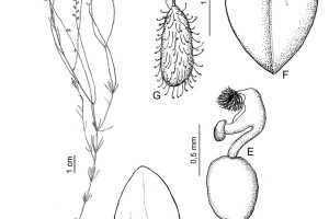 Hierbas de 12-24 cm de largo, erectas; tallos ramificados en la parte media o terminal, pubérulos. Hojas 4-5 verticiladas en la base y verticiladas o alternas en el ápice, sésiles; láminas lineares, de 3-11 × 0,2-0,5 mm, ápice agudo, glabras. Inflorescencias en racimos espiciformes, de 3,5-5 × 0,4-0,6 cm, laxos; brácteas lanceoladas, ca. 1 × 0,4 mm, ápice agudo, glabras, caducas en la antesis; bractéolas lanceoladas, ca. 0,5 × 0,2 mm, ápice agudo, glabras, caducas. Flores ca. 2,3 mm de largo; pedicelos ca. 0,7 mm de largo, glabros; cáliz blanco; sépalos externos glabros; sépalo externo inferior ovado, ca. 1 × 0,5 mm, cóncavo, ápice obtuso; sépalos externos superiores elípticos, ca. 0,8 × 0,3 mm, ápice agudo, libres; sépalos internos “alas” orbiculares a elípticos, ca. 1,4 × 0,8 mm, ápice obtuso, glabros; corola blanca; quilla ca. 1,4 mm de largo, cuña ca. 0,2 mm de largo, cresta ca. 6 lóbulos; pétalos laterales oblongos, ca. 1,5 × 0,4 mm, ápice obtuso, fusionados con la vaina estaminal a través de 1/4 de su margen, manchas no reportadas, glabros; estambres 8, vaina estaminal ca. 0,7 mm de largo, glabra, porción libre de los filamentos estaminales igual o mayor que el largo de las anteras, ca. 0,2 mm de largo, anteras poricidas; ovario elipsoide, ca. 0,1 × 0,1 mm, simétrico, glabro; estilo curvo en forma de “U”, ca. 0,4 mm de largo, área estigmática con el lóbulo estéril terminado en una borla de abundantes tricomas, márgenes glabros, lóbulo fértil sobre un breve soporte. Fruto una cápsula de contorno orbicular, ca. 1,5 × 1 mm, simétrica o levemente asimétrica, margen no alado, glabra. Semillas elipsoides, ca. 0,8 × 0,6 mm, pubescente con tricomas uncinados, rostro poco desarrollado; elaiosomas ausentes.