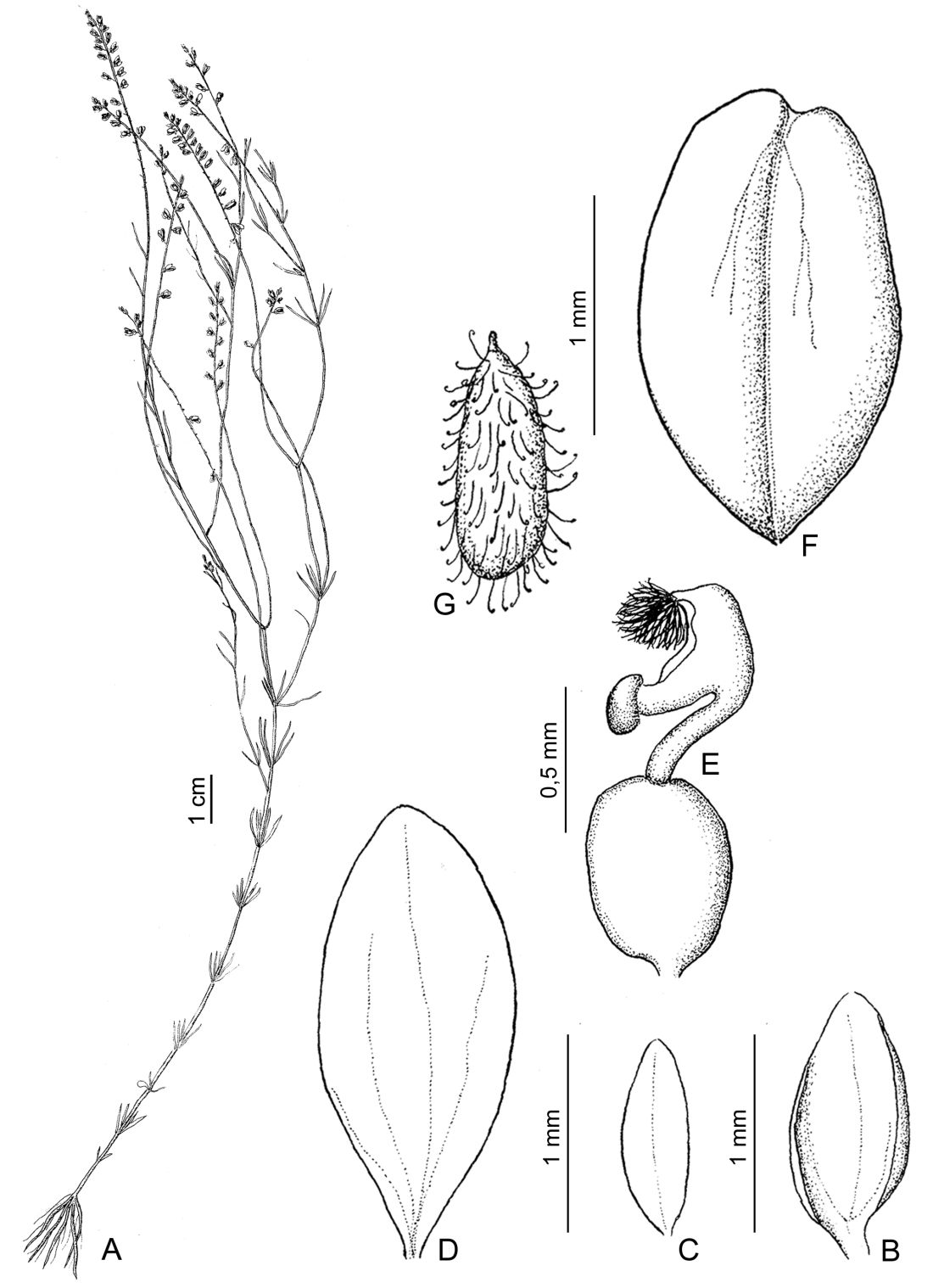 Hierbas de 12-24 cm de largo, erectas; tallos ramificados en la parte media o terminal, pubérulos. Hojas 4-5 verticiladas en la base y verticiladas o alternas en el ápice, sésiles; láminas lineares, de 3-11 × 0,2-0,5 mm, ápice agudo, glabras. Inflorescencias en racimos espiciformes, de 3,5-5 × 0,4-0,6 cm, laxos; brácteas lanceoladas, ca. 1 × 0,4 mm, ápice agudo, glabras, caducas en la antesis; bractéolas lanceoladas, ca. 0,5 × 0,2 mm, ápice agudo, glabras, caducas. Flores ca. 2,3 mm de largo; pedicelos ca. 0,7 mm de largo, glabros; cáliz blanco; sépalos externos glabros; sépalo externo inferior ovado, ca. 1 × 0,5 mm, cóncavo, ápice obtuso; sépalos externos superiores elípticos, ca. 0,8 × 0,3 mm, ápice agudo, libres; sépalos internos “alas” orbiculares a elípticos, ca. 1,4 × 0,8 mm, ápice obtuso, glabros; corola blanca; quilla ca. 1,4 mm de largo, cuña ca. 0,2 mm de largo, cresta ca. 6 lóbulos; pétalos laterales oblongos, ca. 1,5 × 0,4 mm, ápice obtuso, fusionados con la vaina estaminal a través de 1/4 de su margen, manchas no reportadas, glabros; estambres 8, vaina estaminal ca. 0,7 mm de largo, glabra, porción libre de los filamentos estaminales igual o mayor que el largo de las anteras, ca. 0,2 mm de largo, anteras poricidas; ovario elipsoide, ca. 0,1 × 0,1 mm, simétrico, glabro; estilo curvo en forma de “U”, ca. 0,4 mm de largo, área estigmática con el lóbulo estéril terminado en una borla de abundantes tricomas, márgenes glabros, lóbulo fértil sobre un breve soporte. Fruto una cápsula de contorno orbicular, ca. 1,5 × 1 mm, simétrica o levemente asimétrica, margen no alado, glabra. Semillas elipsoides, ca. 0,8 × 0,6 mm, pubescente con tricomas uncinados, rostro poco desarrollado; elaiosomas ausentes.