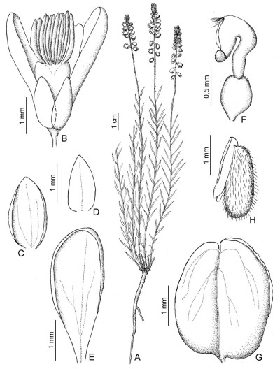 Hierbas de 18-30 cm de largo, erectas a decumbentes; tallos ramifi cados desde la base, pubérulos. Hojas alternas a alterno-espiraladas, sésiles; láminas linear-filiformes, de 6-15 × 0,2-1 mm, ápice agudo, pubérulas. Inflorescencias en racimos espiciformes, de 4-6,5 × 0,5-0,7 cm; brácteas lanceoladas, de 2,5-5,1 × 1,2-2,1 mm, ápice agudo, glabras o remotamente ciliadas, caducas en la antesis; bractéolas lanceoladas, ca. 1,2 × 0,1 mm, ápice agudo, glabras, caducas. Flores de 2,5-3 mm de largo; pedicelos ca. 1 mm de largo, glabros; cáliz blanco o blanco-violáceo; sépalos externos glabros; sépalo externo inferior ovado-elíptico, ca. 2 × 0,7 mm, cóncavo, ápice agudo; sépalos externos superiores elípticos, ca. 1.5 × 0,5 mm, ápice agudo, libres; sépalos internos “alas” elípticos, ca. 2,1 × 1,5 mm, ápice obtuso, glabros; corola blanca a violácea; quilla ca. 2,5 mm de largo, cuña ca. 0,4 mm de largo, cresta con 12-16 lóbulos; pétalos laterales elípticos, ca. 2 × 1 mm, ápice obtuso, fusionados con la vaina estaminal a través de 1/4 de su margen, sin manchas violáceas, glabros; estambres 8, vaina estaminal ca. 1 mm de largo, glabra, porción libre de los filamentos estaminales igual o mayor que el largo de las anteras, ca. 0,3 mm de largo, anteras poricidas; ovario elipsoide, ca. 0,5 × 0,4 mm, simétrico, glabro; estilo curvo en forma de “U”, ca. 0,8 mm de largo, área estigmática con el lóbulo estéril terminado en un mechón de tricomas escasos, márgenes glabros, lóbulo fértil sobre un breve soporte. Fruto una cápsula elipsoide, de 2-2,2 × 1,9-2,1 mm, simétrica o levemente asimétrica, margen no alado o levemente alado, glabra. Semillas elipsoides, de 1,7-1,9 × 0,6-0,7 mm, pubescentes, rostro desarrollado; elaiosomas lineares, de 2/3 del largo de la semilla, libres.