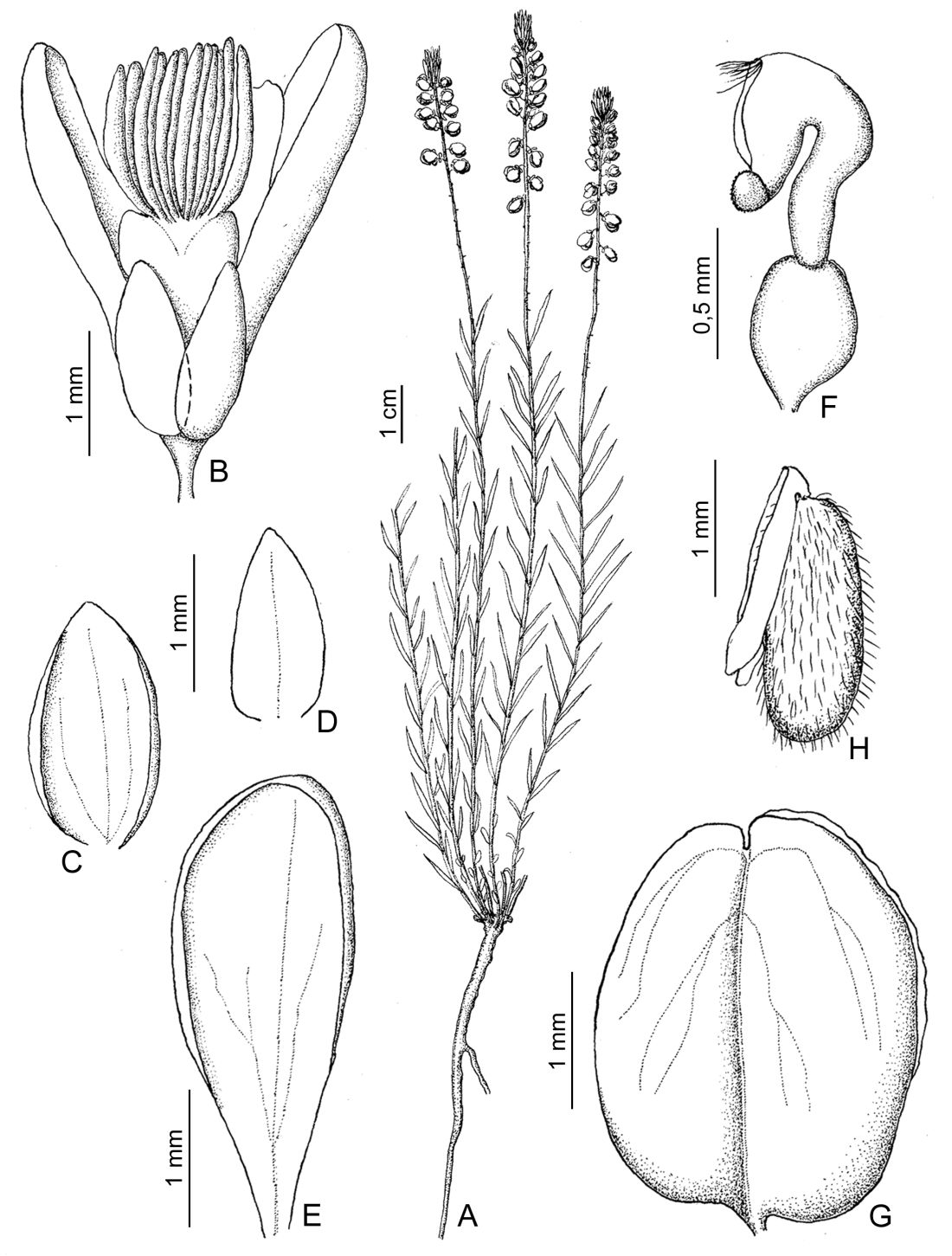 Hierbas de 18-30 cm de largo, erectas a decumbentes; tallos ramifi cados desde la base, pubérulos. Hojas alternas a alterno-espiraladas, sésiles; láminas linear-filiformes, de 6-15 × 0,2-1 mm, ápice agudo, pubérulas. Inflorescencias en racimos espiciformes, de 4-6,5 × 0,5-0,7 cm; brácteas lanceoladas, de 2,5-5,1 × 1,2-2,1 mm, ápice agudo, glabras o remotamente ciliadas, caducas en la antesis; bractéolas lanceoladas, ca. 1,2 × 0,1 mm, ápice agudo, glabras, caducas. Flores de 2,5-3 mm de largo; pedicelos ca. 1 mm de largo, glabros; cáliz blanco o blanco-violáceo; sépalos externos glabros; sépalo externo inferior ovado-elíptico, ca. 2 × 0,7 mm, cóncavo, ápice agudo; sépalos externos superiores elípticos, ca. 1.5 × 0,5 mm, ápice agudo, libres; sépalos internos “alas” elípticos, ca. 2,1 × 1,5 mm, ápice obtuso, glabros; corola blanca a violácea; quilla ca. 2,5 mm de largo, cuña ca. 0,4 mm de largo, cresta con 12-16 lóbulos; pétalos laterales elípticos, ca. 2 × 1 mm, ápice obtuso, fusionados con la vaina estaminal a través de 1/4 de su margen, sin manchas violáceas, glabros; estambres 8, vaina estaminal ca. 1 mm de largo, glabra, porción libre de los filamentos estaminales igual o mayor que el largo de las anteras, ca. 0,3 mm de largo, anteras poricidas; ovario elipsoide, ca. 0,5 × 0,4 mm, simétrico, glabro; estilo curvo en forma de “U”, ca. 0,8 mm de largo, área estigmática con el lóbulo estéril terminado en un mechón de tricomas escasos, márgenes glabros, lóbulo fértil sobre un breve soporte. Fruto una cápsula elipsoide, de 2-2,2 × 1,9-2,1 mm, simétrica o levemente asimétrica, margen no alado o levemente alado, glabra. Semillas elipsoides, de 1,7-1,9 × 0,6-0,7 mm, pubescentes, rostro desarrollado; elaiosomas lineares, de 2/3 del largo de la semilla, libres.
