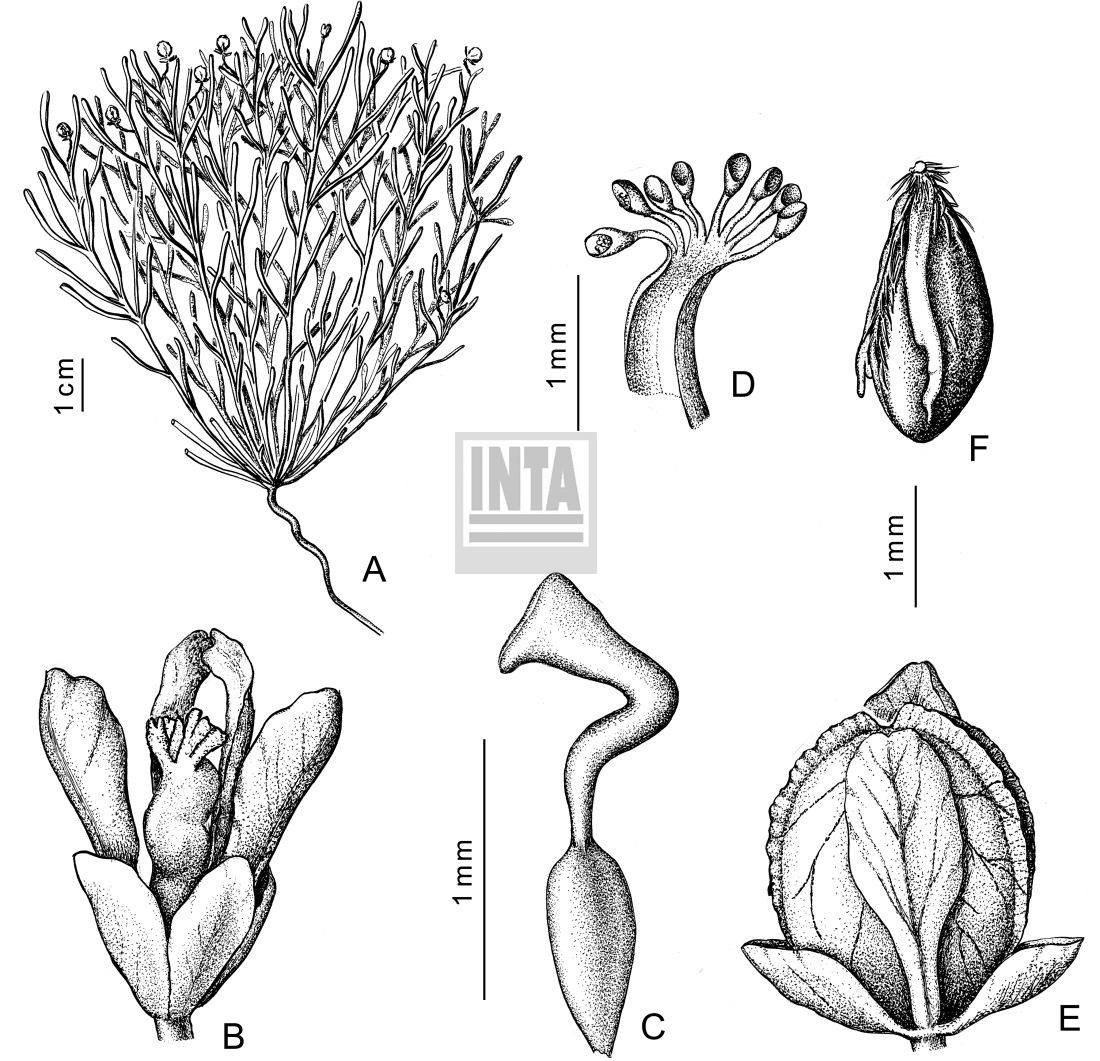 Hierbas de 4-10 cm de alto, erectas; tallos ramificados desde la base, glabros. Hojas alternas, sésiles; láminas lineares, de 8-20 × 0,5-1,5 mm, ápice obtuso, glabras. Inflorescenias en racimos espiciformes, de 0,4-0,9 × 0,5-0,7 cm, laxos, las flores inferiores caducas; brácteas elípticas, ca. 1 × 0,5 mm, ápice agudo, glabras, caducas en la antesis; bractéolas lineares a triangulares, ca. 0,5 × 0,2 mm, ápice agudo, glabras, caducas o persistentes. Flores de 2-3 mm de largo; pedicelos de 0,3-0,5 mm de largo, glabros; cáliz blanco a violáceo con una estría violácea oscura en el medio; sépalos externos glabros; sépalo externo inferior ovado, ca. 1,5 × 1 mm, cóncavo, ápice obtuso; sépalos externos superiores elípticos, ca. 1,3 × 0,8 mm, ápice obtuso, libres; sépalos internos “alas” oblongos o elípticos, ca. 3 × 1 mm, unguiculados, ápice obtuso a emarginado, glabros; corola blanca; quilla ca. 1,7 mm de largo, cuña ca. 0,8 mm de largo, cresta con 8-10 lóbulos; pétalos laterales lineares a oblongos, ca. 2 × 0,5 mm, ápice agudo, fusionados con la vaina estaminal a través de 1/4 de su margen, con manchas violáceas en el ápice, glabros, levemente pubescentes en la porción media adaxial; estambres 8, vaina estaminal ca. 1 mm de largo, glabra, porción libre de los fi lamentos estaminales mayor que el largo de las anteras, ca. 0,5 mm de largo, anteras poricidas; ovario elipsoide, ca. 0,5 × 0,4 mm, simétrico, glabro; estilo geniculado, ca. 1 mm de largo, área estigmática con el lóbulo estéril agudo, glabro, márgenes parcialmente cubriendo al lóbulo fértil. Fruto una cápsula elipsoide, ca. 2 × 2 mm, simétrica, margen alado, glabra. Semillas piriformes, ca. 2 × 1 mm, glabras o con tricomas escasos en la línea rafeal, lustrosas, rostro desarrollado; elaiosomas lineares, de hasta 3/4 el largo total de la semilla, libres.