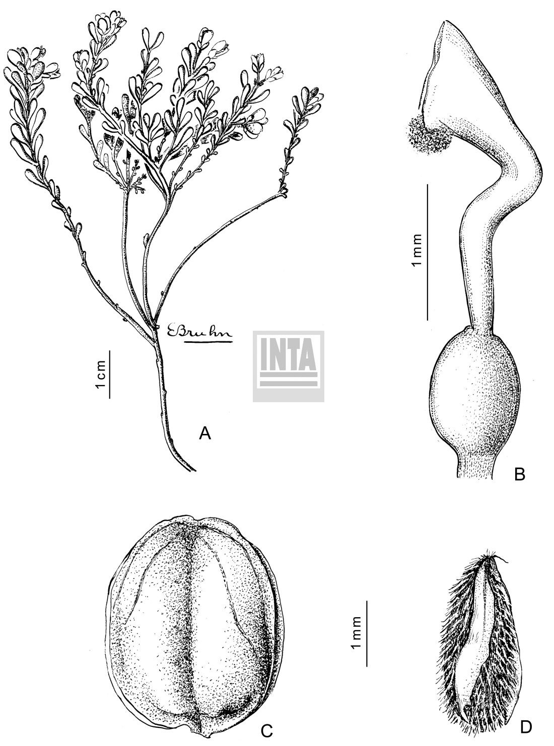 Hierbas de 5-20 cm de largo, postradas; tallos ramificados desde la base, glabros. Hojas alternas, sésiles; láminas espatuladas, de 5-10 × 0,8-1 mm, ápice obtuso o agudo, glabras. Inflorescencias en racimos capituliformes, de 0,5-0,6 × 0,8-1 cm, paucifloros, laxos; brácteas ampliamente orbiculares, ca. 0,8 × 1 mm, ápice agudo, glabras, papiráceas, persistentes; bractéolas elípticas, de 0,6 × 0,4 mm, ápice agudo a obtuso, glabras, generalmente persistentes. Flores de 4-5 mm de largo; pedicelos ca. 1 mm de largo, glabros; cáliz violáceo con una estría violácea oscura en el medio; sépalos externos glabros; sépalo externo inferior ovado, de 1,5-2 × 1,5 mm, cóncavo, ápice agudo; sépalos externos superiores lanceolados, de 1,5-2 × 1 mm, ápice agudo, libres; sépalos internos “alas” elípticos, de 3,5-4 × 1,8-2 mm, unguiculados, ápice agudo, glabros; corola violácea; quilla ca. 4 mm de largo, cuña 1-1,5 mm de largo, cresta con 18-24 lóbulos; pétalos laterales oblongos, de 3,8-4 × 0,8-1 mm, ápice obtuso, fusionados con la vaina estaminal a través de 1/4 de su margen, con manchas violáceas en el ápice, glabros, pubescentes en la porción media adaxial; estambres 8, vaina estaminal ca. 1,7 mm de largo, glabra, porción libre de los filamentos estaminales igual que el largo de las anteras, ca. 0,4 mm de largo, anteras poricidas; ovario elipsoide, de 0,8-0,9 × 0,6-0,8 mm, simétrico, glabro; estilo geniculado, ca. 1,5 mm de largo, área estigmática con el lóbulo estéril agudo, ciliado, márgenes parcialmente cubriendo al lóbulo fértil. Fruto una cápsula elipsoide o de contorno orbicular, de 2,5 × 2-2,2 mm, simétrica o levemente asimétrica, margen levemente alado, glabra. Semillas elipsoides, de 2-2,5 × 1 mm, pubescentes, rostro casi nulo; elaiosomas lineares a anchamente orbiculares, de hasta 1/2 del largo total de la semilla, libres.