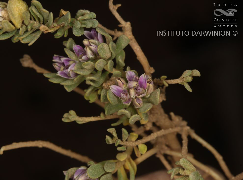 Hierbas de 5-20 cm de largo, postradas; tallos ramificados desde la base, glabros. Hojas alternas, sésiles; láminas espatuladas, de 5-10 × 0,8-1 mm, ápice obtuso o agudo, glabras. Inflorescencias en racimos capituliformes, de 0,5-0,6 × 0,8-1 cm, paucifloros, laxos; brácteas ampliamente orbiculares, ca. 0,8 × 1 mm, ápice agudo, glabras, papiráceas, persistentes; bractéolas elípticas, de 0,6 × 0,4 mm, ápice agudo a obtuso, glabras, generalmente persistentes. Flores de 4-5 mm de largo; pedicelos ca. 1 mm de largo, glabros; cáliz violáceo con una estría violácea oscura en el medio; sépalos externos glabros; sépalo externo inferior ovado, de 1,5-2 × 1,5 mm, cóncavo, ápice agudo; sépalos externos superiores lanceolados, de 1,5-2 × 1 mm, ápice agudo, libres; sépalos internos “alas” elípticos, de 3,5-4 × 1,8-2 mm, unguiculados, ápice agudo, glabros; corola violácea; quilla ca. 4 mm de largo, cuña 1-1,5 mm de largo, cresta con 18-24 lóbulos; pétalos laterales oblongos, de 3,8-4 × 0,8-1 mm, ápice obtuso, fusionados con la vaina estaminal a través de 1/4 de su margen, con manchas violáceas en el ápice, glabros, pubescentes en la porción media adaxial; estambres 8, vaina estaminal ca. 1,7 mm de largo, glabra, porción libre de los filamentos estaminales igual que el largo de las anteras, ca. 0,4 mm de largo, anteras poricidas; ovario elipsoide, de 0,8-0,9 × 0,6-0,8 mm, simétrico, glabro; estilo geniculado, ca. 1,5 mm de largo, área estigmática con el lóbulo estéril agudo, ciliado, márgenes parcialmente cubriendo al lóbulo fértil. Fruto una cápsula elipsoide o de contorno orbicular, de 2,5 × 2-2,2 mm, simétrica o levemente asimétrica, margen levemente alado, glabra. Semillas elipsoides, de 2-2,5 × 1 mm, pubescentes, rostro casi nulo; elaiosomas lineares a anchamente orbiculares, de hasta 1/2 del largo total de la semilla, libres.