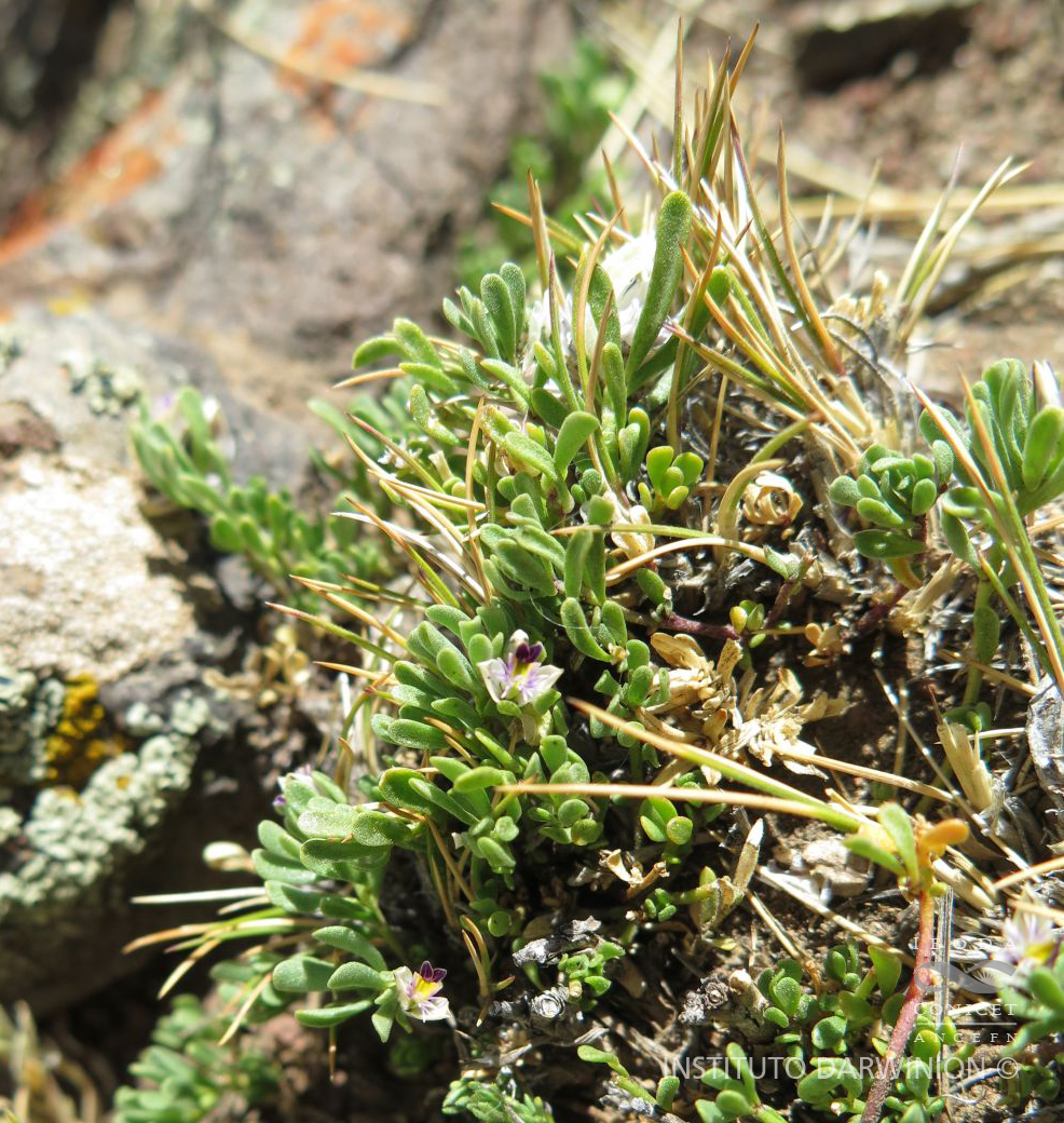 Hierbas de 5-20 cm de largo, postradas; tallos ramificados desde la base, glabros. Hojas alternas, sésiles; láminas espatuladas, de 5-10 × 0,8-1 mm, ápice obtuso o agudo, glabras. Inflorescencias en racimos capituliformes, de 0,5-0,6 × 0,8-1 cm, paucifloros, laxos; brácteas ampliamente orbiculares, ca. 0,8 × 1 mm, ápice agudo, glabras, papiráceas, persistentes; bractéolas elípticas, de 0,6 × 0,4 mm, ápice agudo a obtuso, glabras, generalmente persistentes. Flores de 4-5 mm de largo; pedicelos ca. 1 mm de largo, glabros; cáliz violáceo con una estría violácea oscura en el medio; sépalos externos glabros; sépalo externo inferior ovado, de 1,5-2 × 1,5 mm, cóncavo, ápice agudo; sépalos externos superiores lanceolados, de 1,5-2 × 1 mm, ápice agudo, libres; sépalos internos “alas” elípticos, de 3,5-4 × 1,8-2 mm, unguiculados, ápice agudo, glabros; corola violácea; quilla ca. 4 mm de largo, cuña 1-1,5 mm de largo, cresta con 18-24 lóbulos; pétalos laterales oblongos, de 3,8-4 × 0,8-1 mm, ápice obtuso, fusionados con la vaina estaminal a través de 1/4 de su margen, con manchas violáceas en el ápice, glabros, pubescentes en la porción media adaxial; estambres 8, vaina estaminal ca. 1,7 mm de largo, glabra, porción libre de los filamentos estaminales igual que el largo de las anteras, ca. 0,4 mm de largo, anteras poricidas; ovario elipsoide, de 0,8-0,9 × 0,6-0,8 mm, simétrico, glabro; estilo geniculado, ca. 1,5 mm de largo, área estigmática con el lóbulo estéril agudo, ciliado, márgenes parcialmente cubriendo al lóbulo fértil. Fruto una cápsula elipsoide o de contorno orbicular, de 2,5 × 2-2,2 mm, simétrica o levemente asimétrica, margen levemente alado, glabra. Semillas elipsoides, de 2-2,5 × 1 mm, pubescentes, rostro casi nulo; elaiosomas lineares a anchamente orbiculares, de hasta 1/2 del largo total de la semilla, libres.