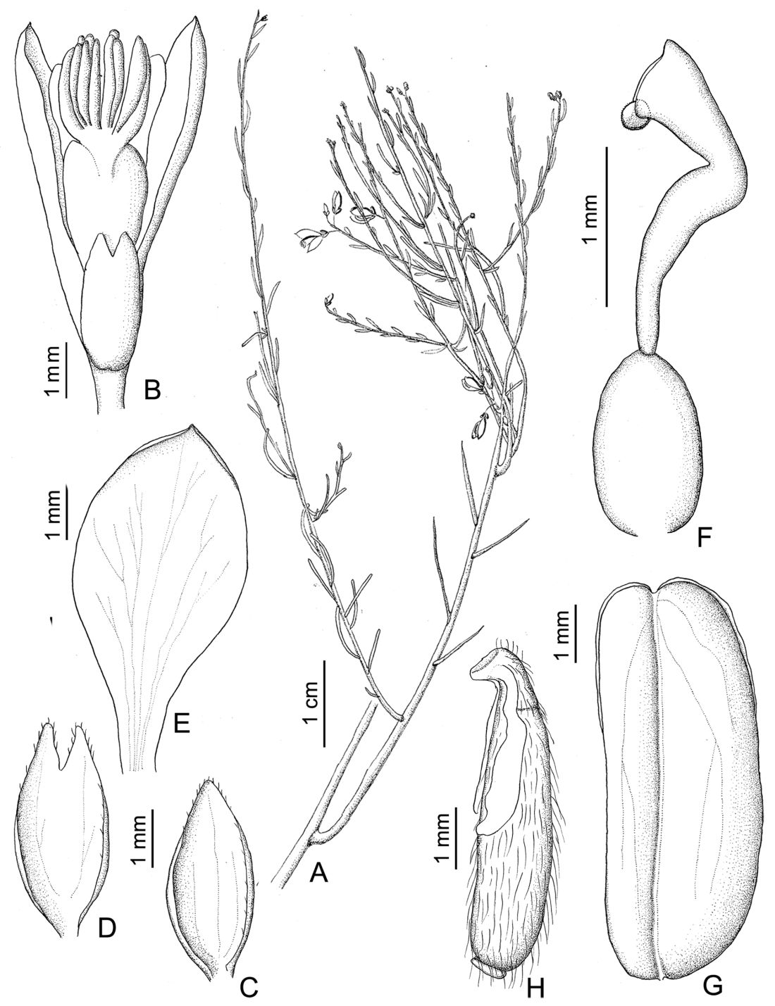 Arbustos de hasta 40 cm de alto, compactos; tallos robustos, ramificados en la parte media, terminados en espinas, glabros o pubérulos con tricomas cortos y curvos. Hojas alternas, sésiles; láminas lanceoladas a lineares, de 3-10 × 0,8-1 mm, ápice agudo, glabras o pubérulas. Inflorescencias en racimos de 1 a 5 flores; brácteas orbiculares a lanceoladas, de 1-1,2 × 0,8-1 mm, ápice agudo u obtuso, ciliadas o con tricomas escasos en la cara abaxial, generalmente persistentes en la antesis; bractéolas orbiculares a lanceoladas, de 1 × 0,8 mm, ápice agudo, ciliadas, generalmente persistentes. Flores de 6-7 mm de largo; pedicelos ca. 2 mm de largo, glabros; cáliz blanco a violáceo; sépalos externos ciliados; sépalo externo inferior ovado, de 2-2,2 × 1-1,5 mm, cóncavo, ápice agudo; sépalos externos superiores elípticos a ovados, de 1,8-2 × 1-1,5 mm, ápice agudo a obtuso, connados (excepcionalmente libres); sépalos internos “alas” elípticos a espatulados, de 4-5 × 2-2,5 mm, unguiculados, simétricos o levemente asimétricos, ápice obtuso o agudo, glabros; corola blanca a violácea; quilla de 4-5 mm de largo, cuña de 1-2 mm de largo, cresta con 28-30 lóbulos; pétalos laterales oblongos, de 3-5 × 1 mm, ápice obtuso, fusionados con la vaina estaminal a través de 1/4 de su margen, con manchas violáceas en el ápice, glabros, pubescentes en la porción media adaxial; estambres 8, vaina estaminal de 2-2,5 mm de largo, glabra, porción libre de los filamentos estaminales mayor que el largo de las anteras, ca. 0,8 mm de largo, anteras poricidas; ovario elipsoide, de 1-1,5 × 0,7 mm, simétrico, glabro; estilo geniculado, ca. 2 mm de largo, área estigmática con el lóbulo estéril levemente agudo, glabro, márgenes parcialmente cubriendo al lóbulo fértil. Fruto una cápsula elipsoide, de 4-6 × 2-2,5 mm, simétrica, margen levemente alado, glabra. Semillas cilíndricas, de 4-5 × 1 mm, pubescentes, rostro muy desarrollado; elaiosomas lineares, de 1/2 a 3/4 del largo de la semilla, libres, a veces portando un pequeño arilo en la base de la semilla.