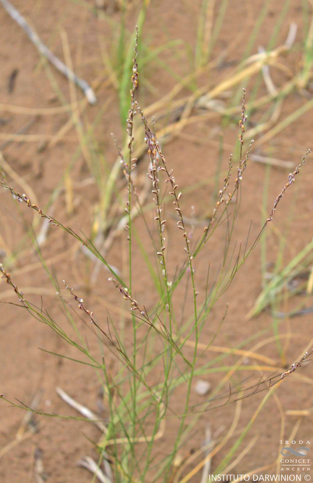 Hierbas de 5-25 cm de alto, erectas; tallos ramificados des de la base, glabros. Hojas alternas, sésiles; láminas filiformes, de 5-25 × 0,5-1 mm, ápice agudo, glabras. Inflorescencias en racimos espiciformes, de 2-15 × 0,7-0,9 cm, laxos, con una distancia entre las fl ores de 2,5-15 mm en la porción media de la inflorescencia; brácteas triangulares a lanceoladas, de 1-1,5 × 0,5-1 mm, ápice agudo, glabras, generalmente caducas en la antesis; bractéolas ovaladas a lanceoladas, de 0,5-0,8 × 0,2-0,4 mm, ápice agudo, glabras, caducas o persistentes. Flores de 5-6 mm de largo; pedicelos de 0,6-1 mm de largo, glabros; cáliz blanco con una estría violácea-oscura en el medio; sépalos externos glabros; sépalo externo inferior ovado, de 1,7-2 × 1-1,1 mm, cóncavo, ápice agudo a obtuso; sépalos externos superiores ovados a lanceolados, de 1,5-1,8 × 0,8-1,2 mm, ápice agudo, libres; sépalos internos “alas” oblongos, de 3-4 × 1,7-2,5 mm, unguiculados, ápice obtuso a truncado, glabros; corola blanca a violácea; quilla de 3,5-4,5 mm de largo, cuña de 1,5-2 mm de largo, cresta con 14-23 lóbulos; pétalos laterales oblongos a romboidales, de 4-4,5 × 1-1,5 mm, ápice obtuso, fusionados con la vaina estaminal a través de 1/4 a 1/3 de su margen, con manchas violáceas en el ápice, glabros, pubescentes en la porción media adaxial; estambres 8, vaina estaminal de 1-2,3 mm de largo, glabra, porción libre de los fi lamentos estaminales igual o mayor que el largo de las anteras, 0,8-1 mm de largo, anteras poricidas; ovario elipsoide a ovoide, de 1-1,5 × 0,5-1 mm, simétrico, glabro; estilo notablemente geniculado, de 1,5-2 mm de largo, área estigmática con el lóbulo estéril agudo, glabro, márgenes parcialmente cubriendo al lóbulo fértil. Fruto una cápsula de contorno oblongo, de 3-5,5 × 1,7-2,4 mm, simétrica, margen levemente alado. Semillas cilíndricas, de 2,2-3,5 × 1 mm, pubescentes, rostro desarrollado; elaiosomas lineares, de ½-3/4 del largo de la semilla, libres, a veces portando un pequeño arilo en la base de la semilla.