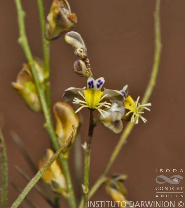 Hierbas de 5-25 cm de alto, erectas; tallos ramificados des de la base, glabros. Hojas alternas, sésiles; láminas filiformes, de 5-25 × 0,5-1 mm, ápice agudo, glabras. Inflorescencias en racimos espiciformes, de 2-15 × 0,7-0,9 cm, laxos, con una distancia entre las fl ores de 2,5-15 mm en la porción media de la inflorescencia; brácteas triangulares a lanceoladas, de 1-1,5 × 0,5-1 mm, ápice agudo, glabras, generalmente caducas en la antesis; bractéolas ovaladas a lanceoladas, de 0,5-0,8 × 0,2-0,4 mm, ápice agudo, glabras, caducas o persistentes. Flores de 5-6 mm de largo; pedicelos de 0,6-1 mm de largo, glabros; cáliz blanco con una estría violácea-oscura en el medio; sépalos externos glabros; sépalo externo inferior ovado, de 1,7-2 × 1-1,1 mm, cóncavo, ápice agudo a obtuso; sépalos externos superiores ovados a lanceolados, de 1,5-1,8 × 0,8-1,2 mm, ápice agudo, libres; sépalos internos “alas” oblongos, de 3-4 × 1,7-2,5 mm, unguiculados, ápice obtuso a truncado, glabros; corola blanca a violácea; quilla de 3,5-4,5 mm de largo, cuña de 1,5-2 mm de largo, cresta con 14-23 lóbulos; pétalos laterales oblongos a romboidales, de 4-4,5 × 1-1,5 mm, ápice obtuso, fusionados con la vaina estaminal a través de 1/4 a 1/3 de su margen, con manchas violáceas en el ápice, glabros, pubescentes en la porción media adaxial; estambres 8, vaina estaminal de 1-2,3 mm de largo, glabra, porción libre de los fi lamentos estaminales igual o mayor que el largo de las anteras, 0,8-1 mm de largo, anteras poricidas; ovario elipsoide a ovoide, de 1-1,5 × 0,5-1 mm, simétrico, glabro; estilo notablemente geniculado, de 1,5-2 mm de largo, área estigmática con el lóbulo estéril agudo, glabro, márgenes parcialmente cubriendo al lóbulo fértil. Fruto una cápsula de contorno oblongo, de 3-5,5 × 1,7-2,4 mm, simétrica, margen levemente alado. Semillas cilíndricas, de 2,2-3,5 × 1 mm, pubescentes, rostro desarrollado; elaiosomas lineares, de ½-3/4 del largo de la semilla, libres, a veces portando un pequeño arilo en la base de la semilla.
