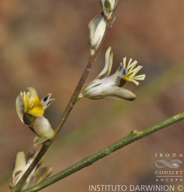 Hierbas de 5-25 cm de alto, erectas; tallos ramificados des de la base, glabros. Hojas alternas, sésiles; láminas filiformes, de 5-25 × 0,5-1 mm, ápice agudo, glabras. Inflorescencias en racimos espiciformes, de 2-15 × 0,7-0,9 cm, laxos, con una distancia entre las fl ores de 2,5-15 mm en la porción media de la inflorescencia; brácteas triangulares a lanceoladas, de 1-1,5 × 0,5-1 mm, ápice agudo, glabras, generalmente caducas en la antesis; bractéolas ovaladas a lanceoladas, de 0,5-0,8 × 0,2-0,4 mm, ápice agudo, glabras, caducas o persistentes. Flores de 5-6 mm de largo; pedicelos de 0,6-1 mm de largo, glabros; cáliz blanco con una estría violácea-oscura en el medio; sépalos externos glabros; sépalo externo inferior ovado, de 1,7-2 × 1-1,1 mm, cóncavo, ápice agudo a obtuso; sépalos externos superiores ovados a lanceolados, de 1,5-1,8 × 0,8-1,2 mm, ápice agudo, libres; sépalos internos “alas” oblongos, de 3-4 × 1,7-2,5 mm, unguiculados, ápice obtuso a truncado, glabros; corola blanca a violácea; quilla de 3,5-4,5 mm de largo, cuña de 1,5-2 mm de largo, cresta con 14-23 lóbulos; pétalos laterales oblongos a romboidales, de 4-4,5 × 1-1,5 mm, ápice obtuso, fusionados con la vaina estaminal a través de 1/4 a 1/3 de su margen, con manchas violáceas en el ápice, glabros, pubescentes en la porción media adaxial; estambres 8, vaina estaminal de 1-2,3 mm de largo, glabra, porción libre de los fi lamentos estaminales igual o mayor que el largo de las anteras, 0,8-1 mm de largo, anteras poricidas; ovario elipsoide a ovoide, de 1-1,5 × 0,5-1 mm, simétrico, glabro; estilo notablemente geniculado, de 1,5-2 mm de largo, área estigmática con el lóbulo estéril agudo, glabro, márgenes parcialmente cubriendo al lóbulo fértil. Fruto una cápsula de contorno oblongo, de 3-5,5 × 1,7-2,4 mm, simétrica, margen levemente alado. Semillas cilíndricas, de 2,2-3,5 × 1 mm, pubescentes, rostro desarrollado; elaiosomas lineares, de ½-3/4 del largo de la semilla, libres, a veces portando un pequeño arilo en la base de la semilla.