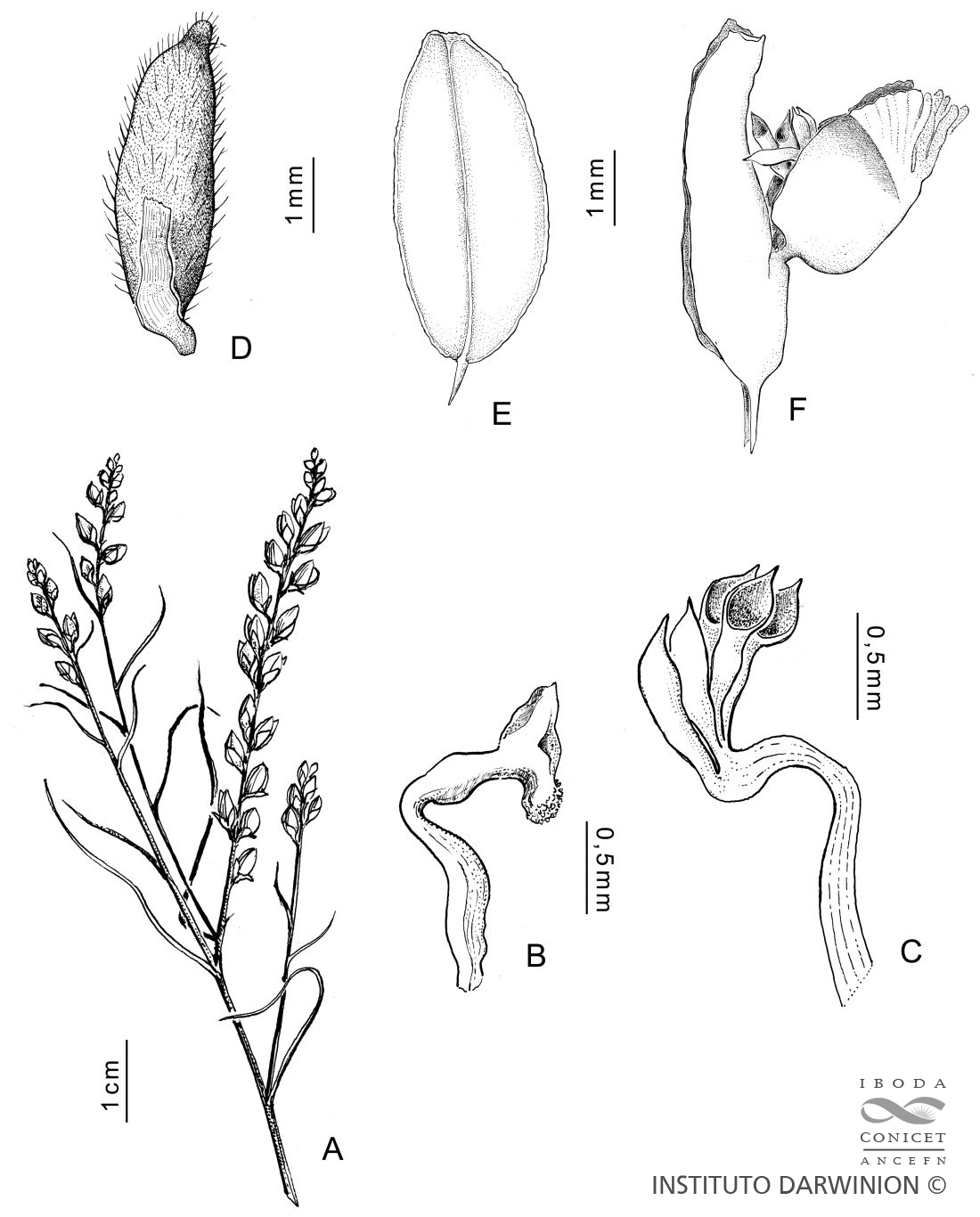 Hierbas de 5-25 cm de alto, erectas; tallos ramificados des de la base, glabros. Hojas alternas, sésiles; láminas filiformes, de 5-25 × 0,5-1 mm, ápice agudo, glabras. Inflorescencias en racimos espiciformes, de 2-15 × 0,7-0,9 cm, laxos, con una distancia entre las fl ores de 2,5-15 mm en la porción media de la inflorescencia; brácteas triangulares a lanceoladas, de 1-1,5 × 0,5-1 mm, ápice agudo, glabras, generalmente caducas en la antesis; bractéolas ovaladas a lanceoladas, de 0,5-0,8 × 0,2-0,4 mm, ápice agudo, glabras, caducas o persistentes. Flores de 5-6 mm de largo; pedicelos de 0,6-1 mm de largo, glabros; cáliz blanco con una estría violácea-oscura en el medio; sépalos externos glabros; sépalo externo inferior ovado, de 1,7-2 × 1-1,1 mm, cóncavo, ápice agudo a obtuso; sépalos externos superiores ovados a lanceolados, de 1,5-1,8 × 0,8-1,2 mm, ápice agudo, libres; sépalos internos “alas” oblongos, de 3-4 × 1,7-2,5 mm, unguiculados, ápice obtuso a truncado, glabros; corola blanca a violácea; quilla de 3,5-4,5 mm de largo, cuña de 1,5-2 mm de largo, cresta con 14-23 lóbulos; pétalos laterales oblongos a romboidales, de 4-4,5 × 1-1,5 mm, ápice obtuso, fusionados con la vaina estaminal a través de 1/4 a 1/3 de su margen, con manchas violáceas en el ápice, glabros, pubescentes en la porción media adaxial; estambres 8, vaina estaminal de 1-2,3 mm de largo, glabra, porción libre de los fi lamentos estaminales igual o mayor que el largo de las anteras, 0,8-1 mm de largo, anteras poricidas; ovario elipsoide a ovoide, de 1-1,5 × 0,5-1 mm, simétrico, glabro; estilo notablemente geniculado, de 1,5-2 mm de largo, área estigmática con el lóbulo estéril agudo, glabro, márgenes parcialmente cubriendo al lóbulo fértil. Fruto una cápsula de contorno oblongo, de 3-5,5 × 1,7-2,4 mm, simétrica, margen levemente alado. Semillas cilíndricas, de 2,2-3,5 × 1 mm, pubescentes, rostro desarrollado; elaiosomas lineares, de ½-3/4 del largo de la semilla, libres, a veces portando un pequeño arilo en la base de la semilla.