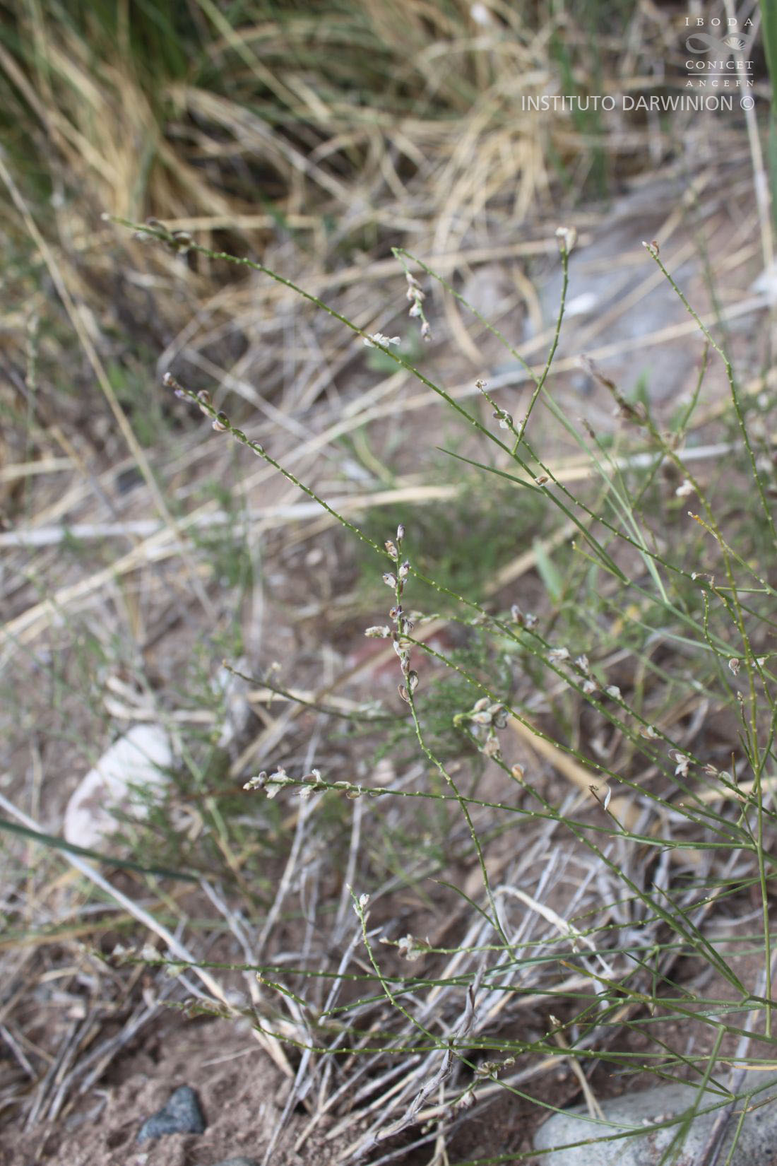 Hierbas de 5-25 cm de alto, erectas; tallos ramificados des de la base, glabros. Hojas alternas, sésiles; láminas filiformes, de 5-25 × 0,5-1 mm, ápice agudo, glabras. Inflorescencias en racimos espiciformes, de 2-15 × 0,7-0,9 cm, laxos, con una distancia entre las fl ores de 2,5-15 mm en la porción media de la inflorescencia; brácteas triangulares a lanceoladas, de 1-1,5 × 0,5-1 mm, ápice agudo, glabras, generalmente caducas en la antesis; bractéolas ovaladas a lanceoladas, de 0,5-0,8 × 0,2-0,4 mm, ápice agudo, glabras, caducas o persistentes. Flores de 5-6 mm de largo; pedicelos de 0,6-1 mm de largo, glabros; cáliz blanco con una estría violácea-oscura en el medio; sépalos externos glabros; sépalo externo inferior ovado, de 1,7-2 × 1-1,1 mm, cóncavo, ápice agudo a obtuso; sépalos externos superiores ovados a lanceolados, de 1,5-1,8 × 0,8-1,2 mm, ápice agudo, libres; sépalos internos “alas” oblongos, de 3-4 × 1,7-2,5 mm, unguiculados, ápice obtuso a truncado, glabros; corola blanca a violácea; quilla de 3,5-4,5 mm de largo, cuña de 1,5-2 mm de largo, cresta con 14-23 lóbulos; pétalos laterales oblongos a romboidales, de 4-4,5 × 1-1,5 mm, ápice obtuso, fusionados con la vaina estaminal a través de 1/4 a 1/3 de su margen, con manchas violáceas en el ápice, glabros, pubescentes en la porción media adaxial; estambres 8, vaina estaminal de 1-2,3 mm de largo, glabra, porción libre de los fi lamentos estaminales igual o mayor que el largo de las anteras, 0,8-1 mm de largo, anteras poricidas; ovario elipsoide a ovoide, de 1-1,5 × 0,5-1 mm, simétrico, glabro; estilo notablemente geniculado, de 1,5-2 mm de largo, área estigmática con el lóbulo estéril agudo, glabro, márgenes parcialmente cubriendo al lóbulo fértil. Fruto una cápsula de contorno oblongo, de 3-5,5 × 1,7-2,4 mm, simétrica, margen levemente alado. Semillas cilíndricas, de 2,2-3,5 × 1 mm, pubescentes, rostro desarrollado; elaiosomas lineares, de ½-3/4 del largo de la semilla, libres, a veces portando un pequeño arilo en la base de la semilla.