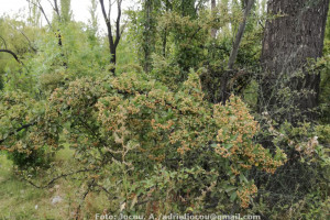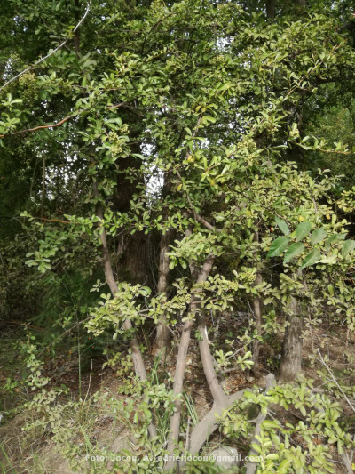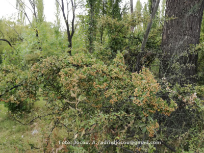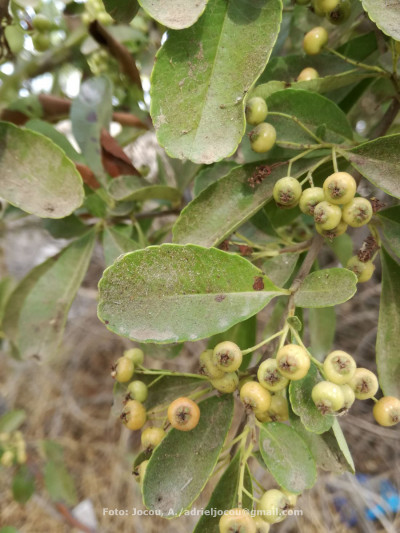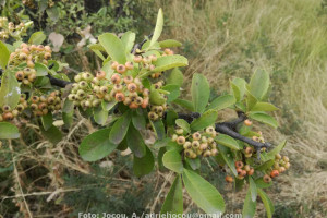 Arbustos hasta de 6 m de alto, espinescentes, en ocasiones inermes; tallos pubérulos con tricomas blanquecinos cuando jóvenes, glabrescentes a la madurez. Hojas con pecíolos de 0,1-0,5 cm de largo, en ocasiones sésiles; lámina espatulada u oblonga, en ocasiones ovada, de 1,5-7 × 0,5-3 cm, ápice generalmente apiculado o emarginado, en ocasiones obtuso, base aguda, atenuada o cuneada, margen crenado o serrado-crenado, ocasionalmente entero en la porción proximal, pubérula en ambas caras cuando joven, glabrescente a la madurez. Inflorescencias con pedúnculos glabros o subglabros. Flores ca. 10 mm de diámetro; pedicelos de 1-6 mm de largo; receptáculo glabro; sépalos de 1-1,5 mm de largo, glabros; pétalos ovados o suborbiculares con ápice redondeado, en ocasiones apiculado, de 3-5 mm de largo. Nuculario globoso o subgloboso, de 4-8 mm de diámetro, rojo o rojo-anaranjado.