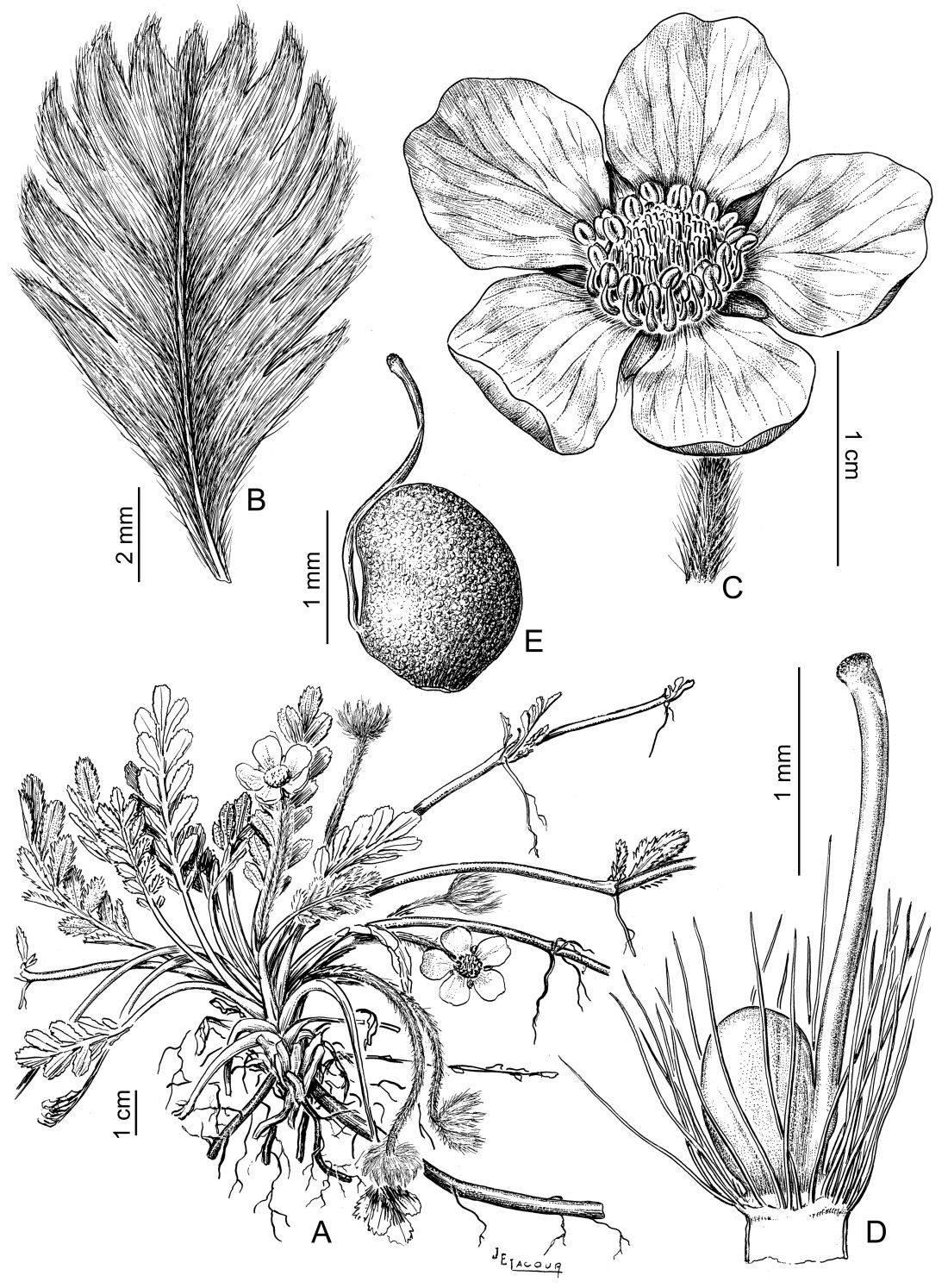 A. Planta. B. Folíolo, cara adaxial. C. Flor. D. Pistilo, vista lateral. E. Aquenio.