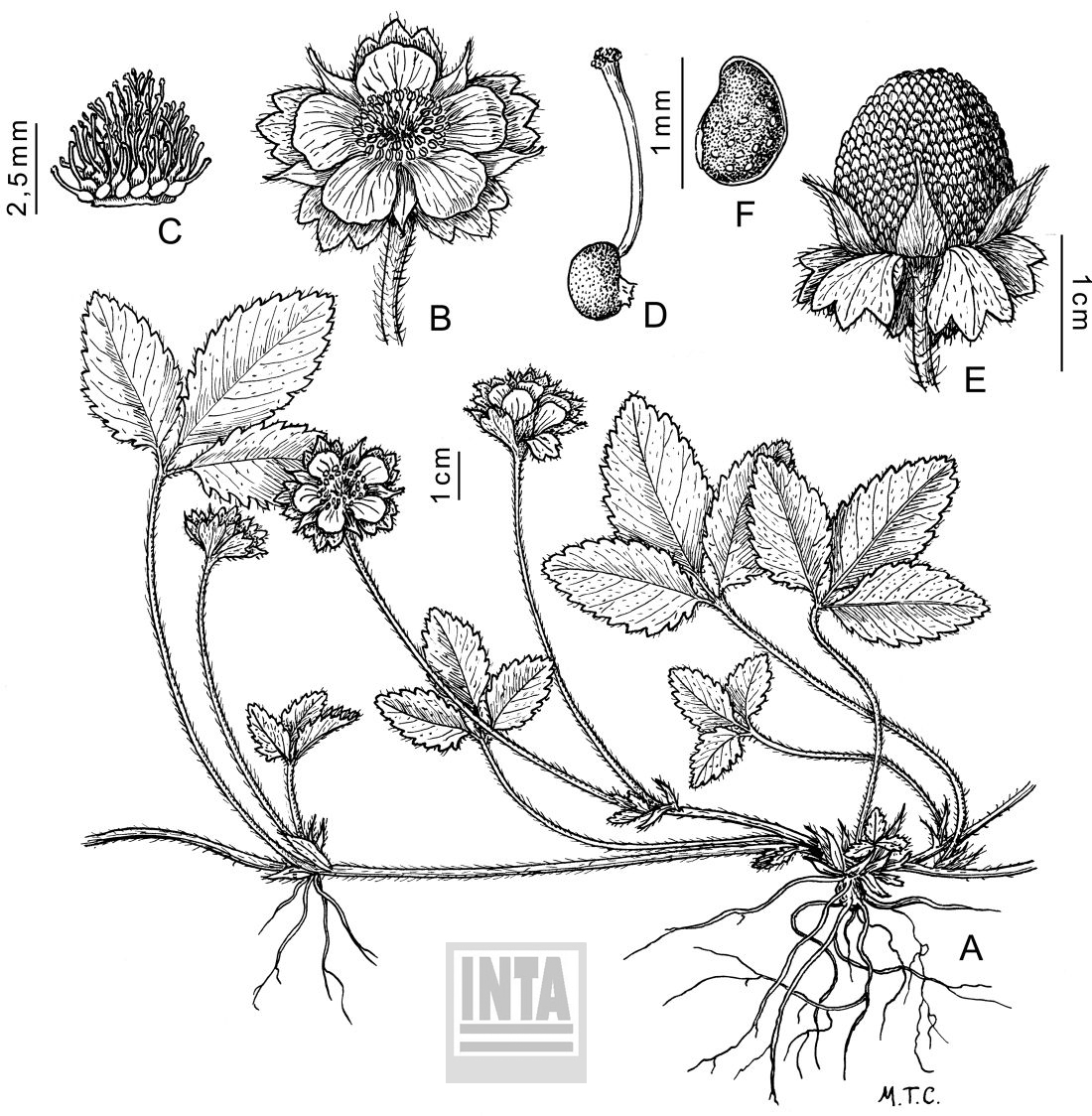 Hierbas anuales, rosuladas, hasta de 0,3 m de alto, estoloníferas. Hojas con pecíolos de 5-16 cm de largo, con pubescencia adpresa rala; folíolos 3(-4), el terminal de mayor tamaño que los laterales, con lámina elíptica u obovado-elíptica, de 1,5-4 × 1,2-3 cm, margen dentado, glabra o con tricomas dispersos en la cara adaxial, serícea en la cara abaxial; estípulas multifidas, en ocasiones 2-partidas o enteras. Flores de 1-2,5 cm de diámetro, solitarias, axilares; sépalos triangulares con ápice atenuado, de 6-10 mm de largo; epicáliz con bractéolas obovadas, 3-5-lobadas; pétalos 5, obovados, de 5-8 mm de largo, amarillos; estigma truncado a levemente capitado. Frutos aquenios reniformes, rojizos u ocráceos, dispuestos sobre el receptáculo carnoso (conocarpo), redondeado, blanco o rojo a la madurez.