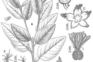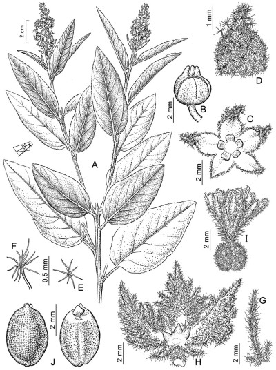 Arbustos o subarbustos monoicos, de 30-90 cm de alto, semidecumbentes a erectos, bastante ramificados desde la base, las ramas ascendentes cubiertas por tricomas estrellados grisáceos; raíz principal bien desarrollada. Hojas alternas; pecíolos de 2-8(-15) mm de largo; estípulas filiformes, de 4-7 mm de largo, pubescentes; láminas angostamente ovadas a elíptico-lanceoladas, de 3-6 × 1,5-3,5 cm, a veces algo involutas, hojas basales en la sombra hasta ca. 8 × 5 cm, verde claras a cenicientas en ambas caras, 3-nervadas en la base y luego pinnatinervadas con 4-7 venas secundarias de cada lado, prominentes en la cara abaxial, ápice agudo a romo, base cuneada a redondeada o subcordada, margen entero a subentero, con tricomas estrellados adpresos y densos en ambas caras. Inflorescencias terminales, cilíndricas a angostamente cónicas, 2-sexuales, de 2-3 × 1-1,5 cm; brácteas angostamente triangulares a lineares, de 4-6 mm de largo, pubescentes. Flores estaminadas con pedicelo de 1-2,5 mm de largo; sépalos 5, anchamente triangulares, ca. 3,5 × 2 mm, márgenes enteros a levemente dentados, cubiertos externamente por tricomas estrellados brevemente estipitados; pétalos 5, algo cuculados, ca. 3 × 2 mm; estambres 11, filamentos de 5-8 mm de largo. Flores pistiladas con pedicelo de 1-2 mm de largo; sépalos 3, anchamente triangulares, de 3-5 × 3-4,5 mm, margen laciniado, ápice agudo, a veces con 2 sépalos rudimentarios de 1,5-2 mm de largo, densamente pubescentes de ambos lados; disco de 3 glándulas elipsoides o triangulares, opuestas a los sépalos grandes; ovario globoso, ca. 3 mm diámetro, cubierto con tricomas estrellados; estilos 3, divergentes, hasta de 14 mm de largo, divididos en la mitad superior una o dos veces, dando 6 a 24 terminaciones estigmáticas, totalmente pubescentes excepto por el ápice. Fruto cápsulas globosas, de 3,5-4,5 mm de diámetro. Semillas de contorno elíptico, ca. 3 × 2 mm, castañas; carúncula subapical mitriforme ca. 1 mm de ancho.
