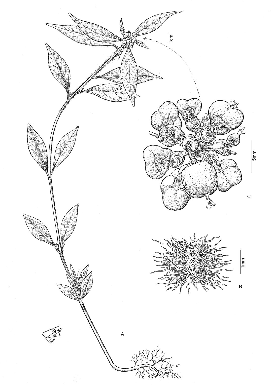 A. Planta. B. Detalle de la pilosidad de los tallos superiores. C. Ciatios umbeliformes en dicasios; véanse las glándulas involucrales y lóbulos fimbriados en cada ciatio.