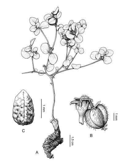 Plantas con numerosas ramas ascendentes hasta de 10 cm de alto, las ramas partiendo de una raíz gruesa, tuberosa, ca. 0,7 × 2 cm. Hojas inferiores con láminas espatuladas, de 10-13 × 7-9 mm, las superiores subcirculares, de 4-6 × 4-6 mm; estípulas ausentes. Ciatios solitarios; involucro campanulado, ca. 1 × 0,8 mm; nectarios 4, semilunares, el quinto vestigial, lóbulos dentados y pilosos. Flores estaminadas 5; bractéolas cilíndricas. Flores pistiladas con perianto triangular ligeramente carnoso; estilos 2-fidos en la mitad distal. Fruto una cápsula globosa, de 2,5-3 × 3-3,5 mm, pilosa. Semillas subprismáticas, de 1,3-2 × 1-1,4 mm, levemente rugosas con pequeños tubérculos, blanca.