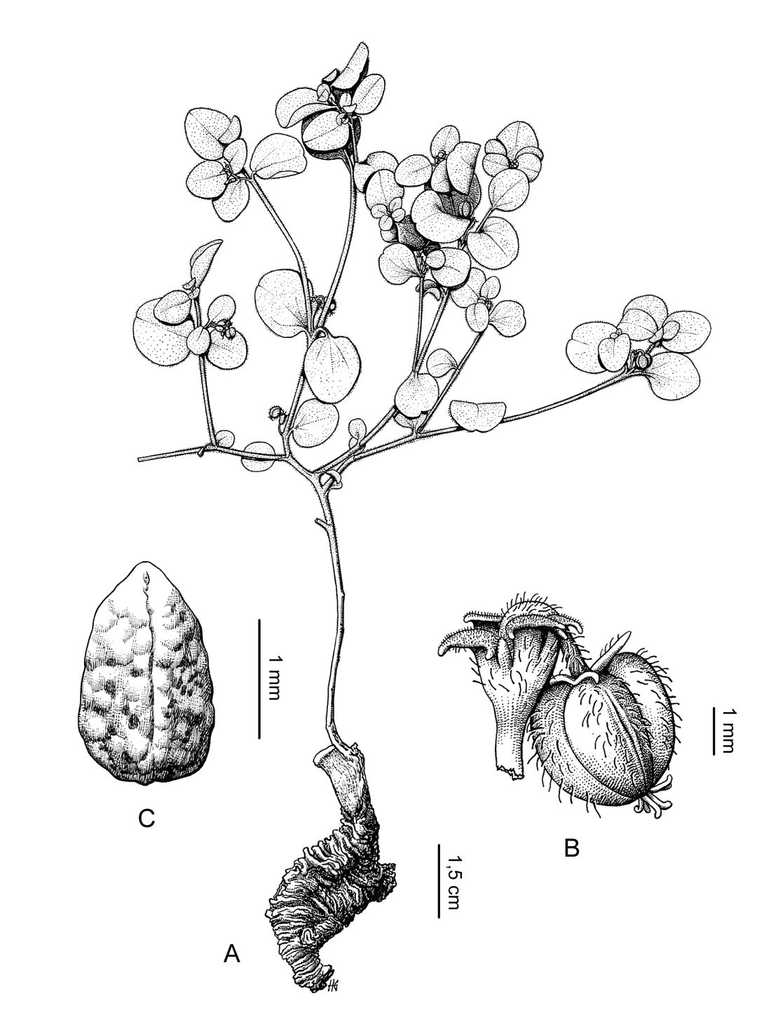 A. Planta. B. Ciatio fructificado. C. Semilla, vista hilar.