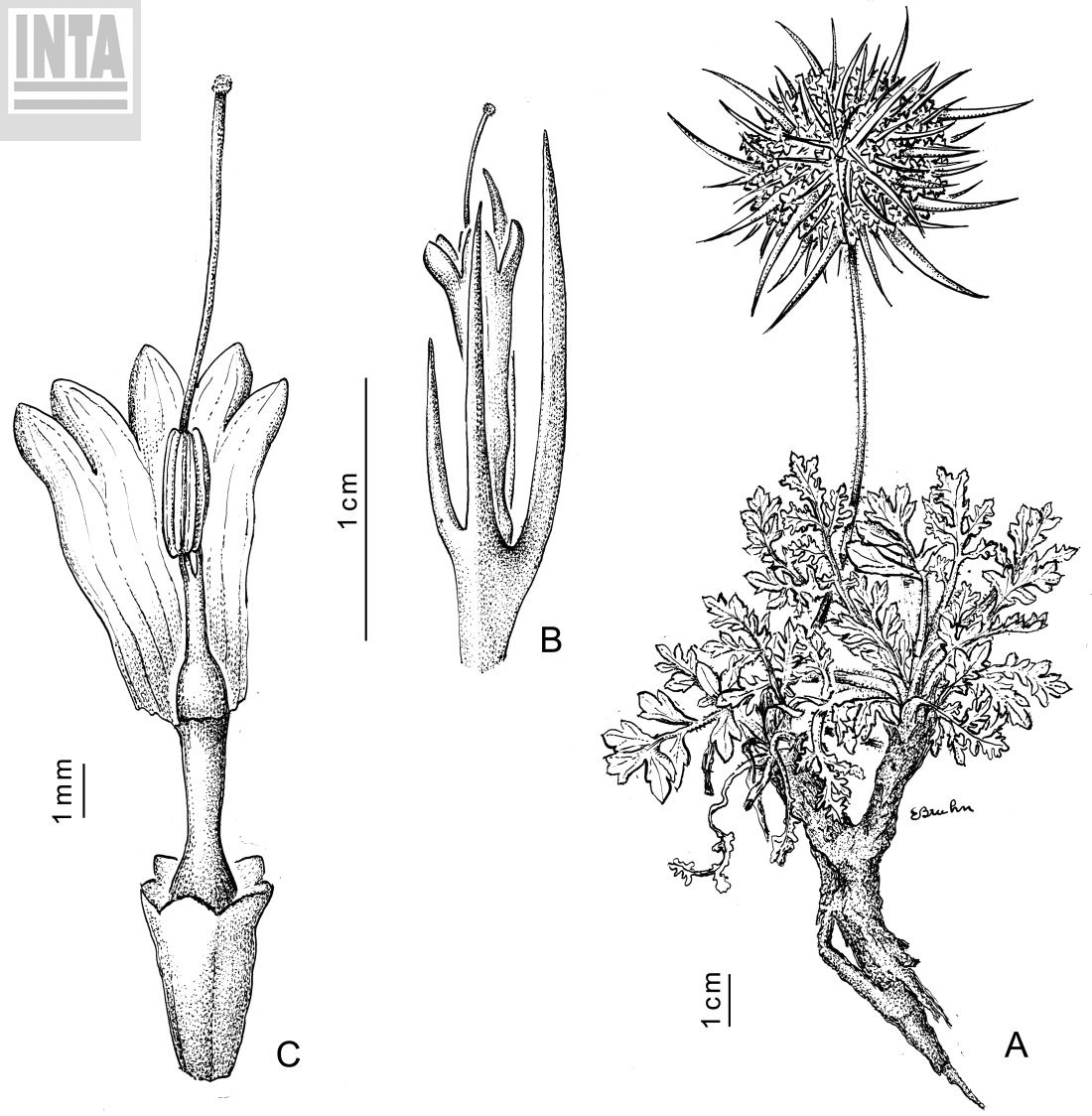 Hierbas caméfitas, lanosas, ca. 10-20 cm de alto. Hojas pinnatisectas, base atenuada en un peciolo rectangular lanoso; lámina oblonga, raquis lanoso, lóbulos obtusos, mucronados. Pedúnculos escapiformes, largos, erectos. Involucro lanoso, con base fusionada pateliforme y lóbulos anchamente rectangulares. Receptáculo lenticular, brácteas espatuladas, lanosas. Flores 5meras. Cáliz polimorfo: 1-2 sépalos desiguales, aciculares, hasta de 12 mm de largo, con sección circular, lignificados en la antesis (primera flor de los grupos cimosos periféricos); 5 sépalos desiguales, lanceolados, planos, hasta de 4 mm de largo, no lignificados en la antesis (flor terminal central, flores solitarias y primera flor de los grupos cimosos internos); 5 sépalos iguales, diminutos, orbiculares, no lignificados en la antesis (segunda y siguientes flores de los grupos cimosos). Tubo estaminal-corolino de 3-3,2 mm de largo, tubo corolino de 3,8-4 mm de largo, cilíndrico, lóbulos corolinos rectangulares, de 0,8-1,2 mm de largo. Tubo estaminal de 1,8-2 mm de largo, filamentos de 0,3 mm de largo, anteras lanceoladas, de 2 mm de largo; tecas de base agudosagitada. Cipselas prismáticas, con 3-5 carenas transversalmente rugosas y no espinosas, o lisas y espinosas, de acuerdo al polimorfismo descrito.