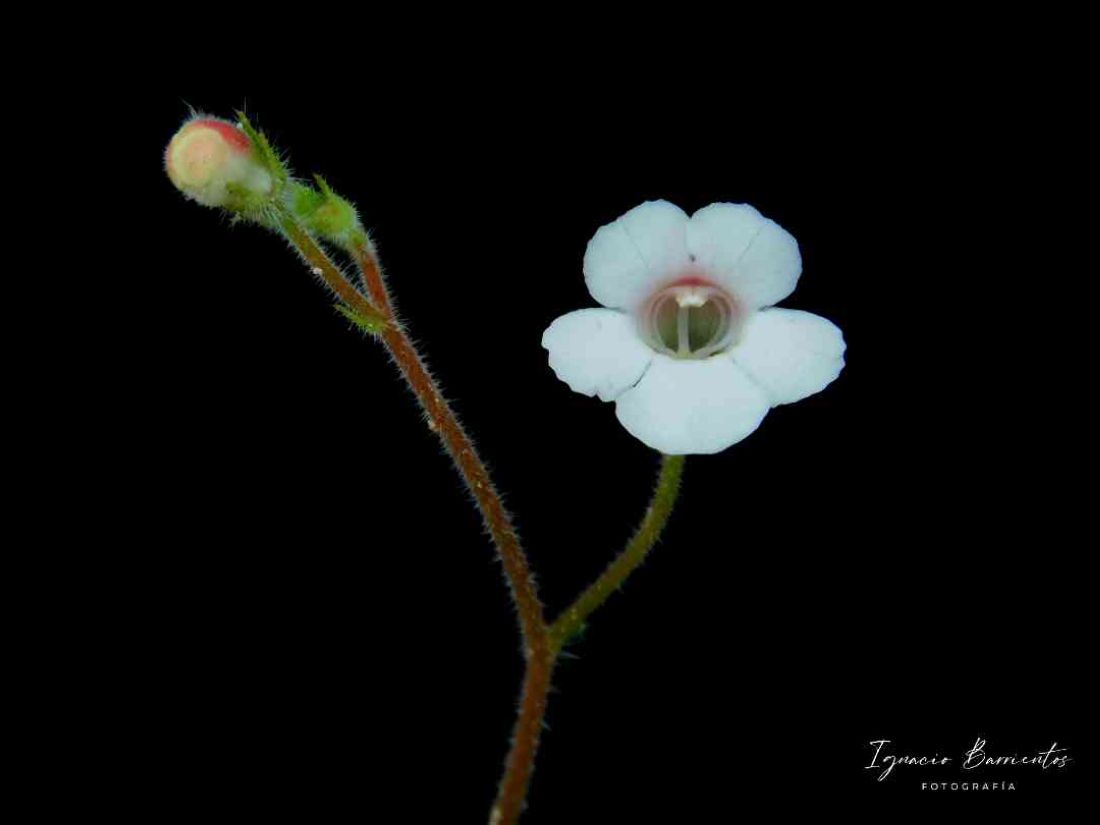 Hierba perenne, de 15-25 cm de alto, con rizomas cubiertos de escamas carnosas, sin estolones. Tallos teretes, erectos, no ramificados, híspidos; entrenudos de 1-3 cm. Hojas opuestas, enteras; pecíolo de 1-2 cm; lámina obovada a elíptica, de 3,5-11,5 × 2,5-9,0 cm, ápice agudo a obtuso, base ligeramente asimétrica, cuneadas o atenuadas, ambas caras pubescentes y verdosas, margen serrado a crenado, con 5-8 pares de venas secundarias. Inflorescencia racimosa, bracteada; racimo terminal o axilar con 3 a 8 flores, de 10-20 cm; pedúnculo de 3-9 cm, híspido. Flores blancas y exteriormente con tintes rosados en el tubo y con líneas más oscuras en la base de la flor, casi actinomorfas, de 0,7-1,1 cm; pedicelo erecto, de 1-1,5 cm, híspido, bracteolado; brácteas lineales a filiformes, de 2,5-3 × 0,5-0,7 mm, verdes; sépalos 5, libres, valvados, de 4-6 mm, lineales a lanceolados, verdes, margen entero; corola infundibuliforme, de prefloración imbricada; tubo de 6-7,9 × 3,4-3,6 mm, blanco, por dentro subglabro, y por fuera escasamente pubescente con tricomas largos, uniseriados, no glandulares; garganta blanca con tintes rosados; lóbulos de 3-4 × 3-4 mm, enteros, blancos, márgenes ligeramente sinuados a dentados, inserción de la corola erecta a levemente oblicua con relación al cáliz; estambres 4, de 1,5-2 mm, inclusos, filamentos glabros, anteras coherentes que se abren mediante hendiduras longitudinales, estaminodio 1; nectario anular no lobulado; ovario ínfero, estilo glabro de 3,5-4 mm, estigma estomatomorfo. Fruto cápsula cónica, de 0,5-0,8 × 2,5-3,5 mm, de ápice curvo, con costillas prominentes, dehiscente sólo apicalmente, pubescente. Semillas numerosas, elipsoides.