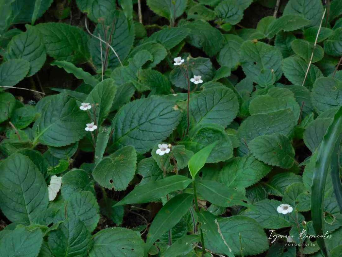 Hierba perenne, de 15-25 cm de alto, con rizomas cubiertos de escamas carnosas, sin estolones. Tallos teretes, erectos, no ramificados, híspidos; entrenudos de 1-3 cm. Hojas opuestas, enteras; pecíolo de 1-2 cm; lámina obovada a elíptica, de 3,5-11,5 × 2,5-9,0 cm, ápice agudo a obtuso, base ligeramente asimétrica, cuneadas o atenuadas, ambas caras pubescentes y verdosas, margen serrado a crenado, con 5-8 pares de venas secundarias. Inflorescencia racimosa, bracteada; racimo terminal o axilar con 3 a 8 flores, de 10-20 cm; pedúnculo de 3-9 cm, híspido. Flores blancas y exteriormente con tintes rosados en el tubo y con líneas más oscuras en la base de la flor, casi actinomorfas, de 0,7-1,1 cm; pedicelo erecto, de 1-1,5 cm, híspido, bracteolado; brácteas lineales a filiformes, de 2,5-3 × 0,5-0,7 mm, verdes; sépalos 5, libres, valvados, de 4-6 mm, lineales a lanceolados, verdes, margen entero; corola infundibuliforme, de prefloración imbricada; tubo de 6-7,9 × 3,4-3,6 mm, blanco, por dentro subglabro, y por fuera escasamente pubescente con tricomas largos, uniseriados, no glandulares; garganta blanca con tintes rosados; lóbulos de 3-4 × 3-4 mm, enteros, blancos, márgenes ligeramente sinuados a dentados, inserción de la corola erecta a levemente oblicua con relación al cáliz; estambres 4, de 1,5-2 mm, inclusos, filamentos glabros, anteras coherentes que se abren mediante hendiduras longitudinales, estaminodio 1; nectario anular no lobulado; ovario ínfero, estilo glabro de 3,5-4 mm, estigma estomatomorfo. Fruto cápsula cónica, de 0,5-0,8 × 2,5-3,5 mm, de ápice curvo, con costillas prominentes, dehiscente sólo apicalmente, pubescente. Semillas numerosas, elipsoides.