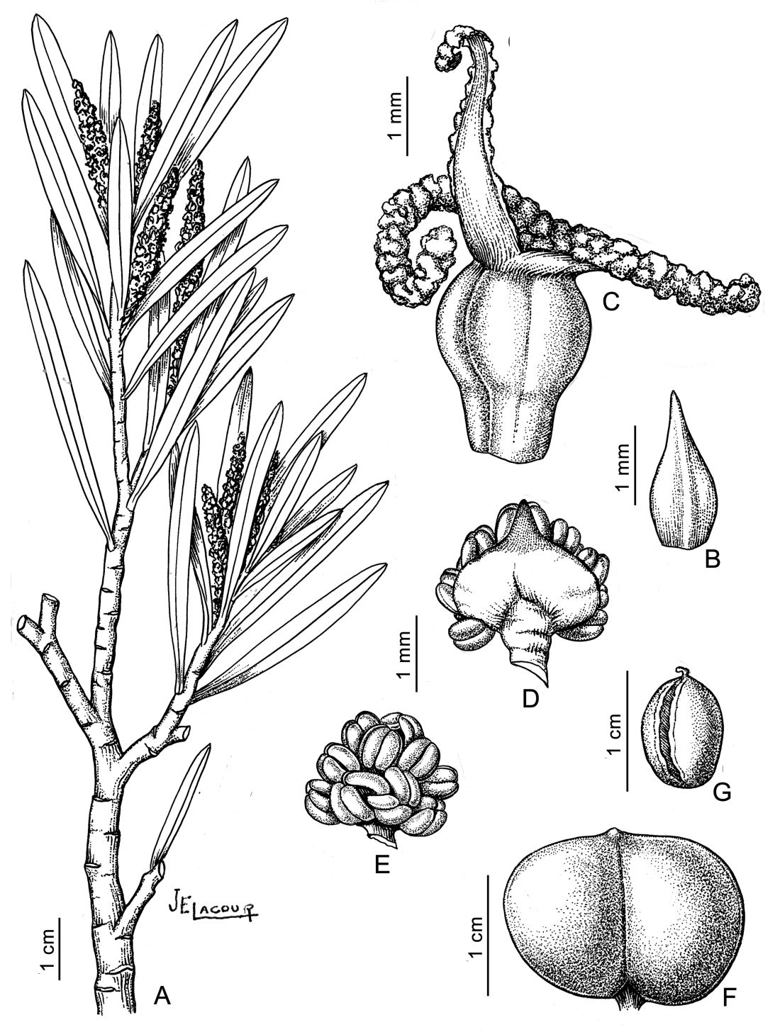 Arbustos bajos de 0,50-2 m de alto, foliosos, ramas fuscas, nodosas, dicótomas en los nudos inferiores. Hojas sésiles; estípulas diminutas, caducas; láminas angostamente elípticas, de 5-7(-9) × 0,4-0,9 cm, ascendentes, rígidas, base atenuada, mucronadas, 1-nervias. Inflorescencias terminales, rojizas, incluidas en el follaje, de 2-3,5 cm de largo, densifloras, con 1(-2) flores pistiladas en la base y más de 15 estaminadas. Flores estaminadas aperiantadas, en címulas 3-4-floras subtendidas por una bráctea anchamente ovada, de ± 1,5 × 2 mm, aguda; estambres 3-4, anteras ca. 0,6 mm de largo, filamentos breves unidos en la base. Flores pistiladas solitarias o de a pares, cada una acompañada por 2 brácteas angostamente ovadas, agudas; sépalos 2-3, ovados, de 0,9 × 2 mm, agudos; estilos 2-3, libres, encorvados, ca. 3 mm de largo, con la cara adaxial papilosa y la abaxial lisa; ovario ovoideo, ca. 1,8-2 mm de largo, 2-3-locular,. Fruto una cápsula 2-3-coca, ca. 1,4 × 2 cm, endocarpo leñoso. Semillas glabras.