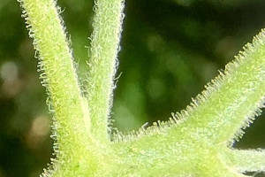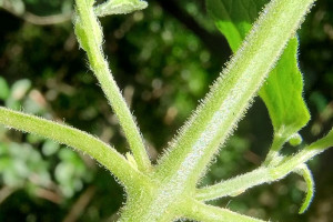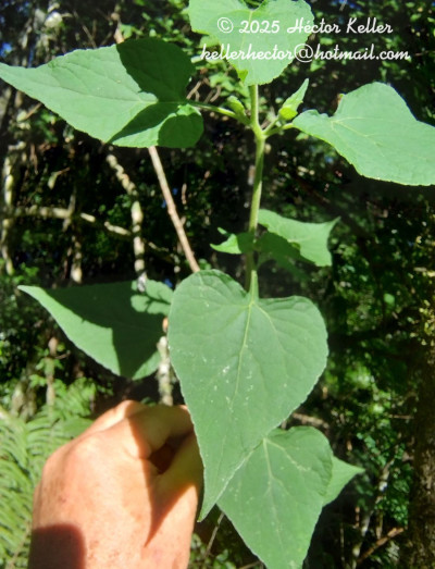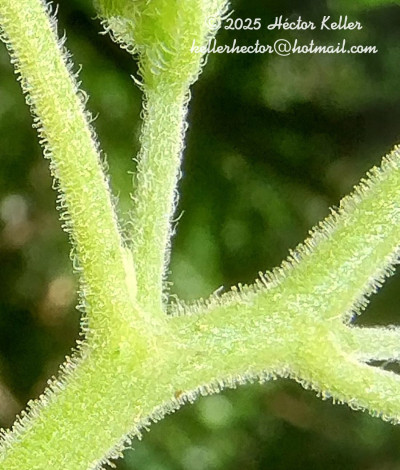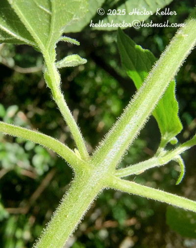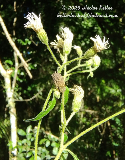 Subarbustos erectos de 1-2 m de alto, con ramas costadas, densamente hirsuto-glandulosas. Hojas opuestas o las superiores alternas, pecioladas, pecíolos de 1-3 cm de largo, láminas ovadas, de 4-9 × 2,5-5 cm, redondeadas o deltoideas en la base, algo decurrentes a lo largo de la parte superior del pecíolo, acuminadas en el ápice, menudamente aserrado-dentadas en el margen, más o menos pubescentes en ambas caras. Capítulos 3-5, muy largamente pedunculados, dispuestos en cimas corimbiformes laxas en los extremos de las ramas. Involucro acampanado de 6- 9 × 6-8 mm; filarios 20-30, en 2-3 series, los externos más cortos, linear-lanceolados, agudos, glanduloso-pubescentes en el dorso. Flores 25-50, corolas ca. 6 mm de largo. Aquenios de 5-6,5 mm de largo, glandulosos. Papus grisáceo o estramíneo.