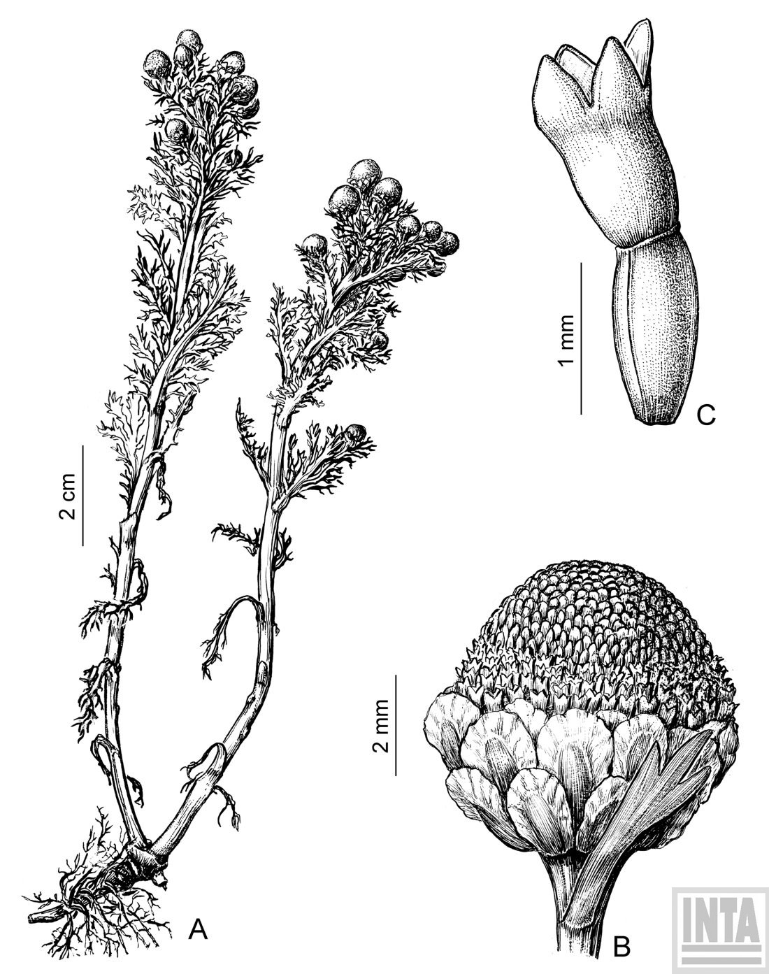Plantas anuales, glabras, con tallos ascendentes o erectos, de (1-)10-40(-50) cm de alto. Hojas sésiles, de contorno elíptico, de (5-)10-65(-85) × 2-20 mm, 1-3-pinnatisectas, segmentos lineares. Capítulos discoides. Involucro en forma de copa de 2,5-3,8 x 6-7 mm; filarios en 3 series, elípticos, redondeados en el ápice, con margen angosto, hialino. Flores todas con corolas tubulosas, de 1,1-1,3 mm de largo, amarillo pálido a verdosas, limbo 4(-5)-lobado. Aquenios subprismáticos, de 1,15-1,5 mm de largo, con 2-4 costillas blanquecinas y 2 glándulas longitudinales oscuras, algo curvados. Papus reducido a un reborde blanquecino.