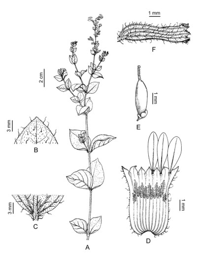 Hierba perenne hasta de 40 cm de alto; tallo decumbente, ramificado desde la base; entrenudos de (1-)1,5-3,5(-4) cm de largo con tricomas adpresos, glandulares y glandulares setáceos. Hojas opuestas, sésiles o con pecíolos hasta de 1,5 mm de largo; láminas ovadas a ovado-lanceoladas, de 9-25(-30) × (6-)9-20(-25) mm, generalmente falcadas y asimétricas, ápice agudo y base redondeada, estrigoso-adpresas en ambas caras, con o sin tricomas glandulares largos en ambas caras o sólo en la cara adaxial. Inflorescencia paniculada, de 2-9 cm de largo; brácteas ovadas o a veces sublineares, de 2-6 × (0,7-)1-3 mm, sésiles o subsésiles, agudas, estrigosoadpresas y ciliadas. Flores alternas, 1-3 por nudo; pedicelos de (1-)2-4(-7) mm de largo, con indumento idéntico que el del tallo pero sin tricomas glandulares; bractéolas ovadas, hasta de 0,8 mm de largo, setosas; tubo floral de (4-)5-6 × 1-1,5 mm, con tricomas erectos, estrigosos y escasos tricomas glandulares cortos; lóbulos deltoides, de 0,4-0,6 × 0,6-1 mm subiguales; apéndicesintersepalinos hasta de 0,3 mm de largo con tricomas estrigoso-adpresos; pétalos obovado-oblongos, de (2,5-)3-4,5 × 1,3-2 mm, glabros o glabrescentes, rosados o violáceos, caducos en la postantesis; estambres insertos en la mitad del tubo calicino, inclusos; ovario de contorno oblongo, asimétrico, ca. 3 mm de largo, glabro, con 6-15 óvulos; estilo ca. 1,2 mm de largo, escasamente viloso, incluso; estigma capitado; disco suberecto a erecto, agudo distalmente, lobulado en la cara superior. Semillas 5-11 por cápsula,suborbiculares a elipsoides, de 1,2-1,6 × 1-1,5 mm, base obtusa y ápice redondeado, de apariencia marginada por el color más claro del borde, castañas a castaño-oscuras.