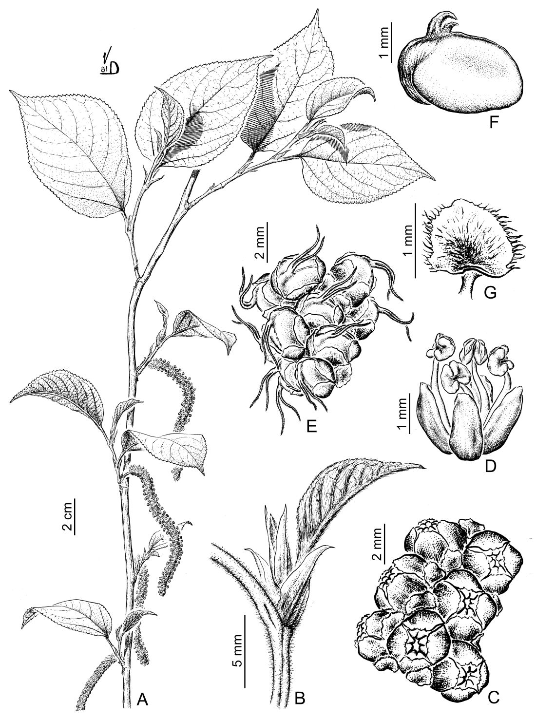 A. Rama con inflorescencia estaminada. B. Estípulas terminales. C. Flores estaminadas cerradas y brácteas interflorales. D. Flor estaminada. E. Inflorescencia pistilada. F. Fruto. G. Bráctea interfloral de la inflorescencia pistilada.