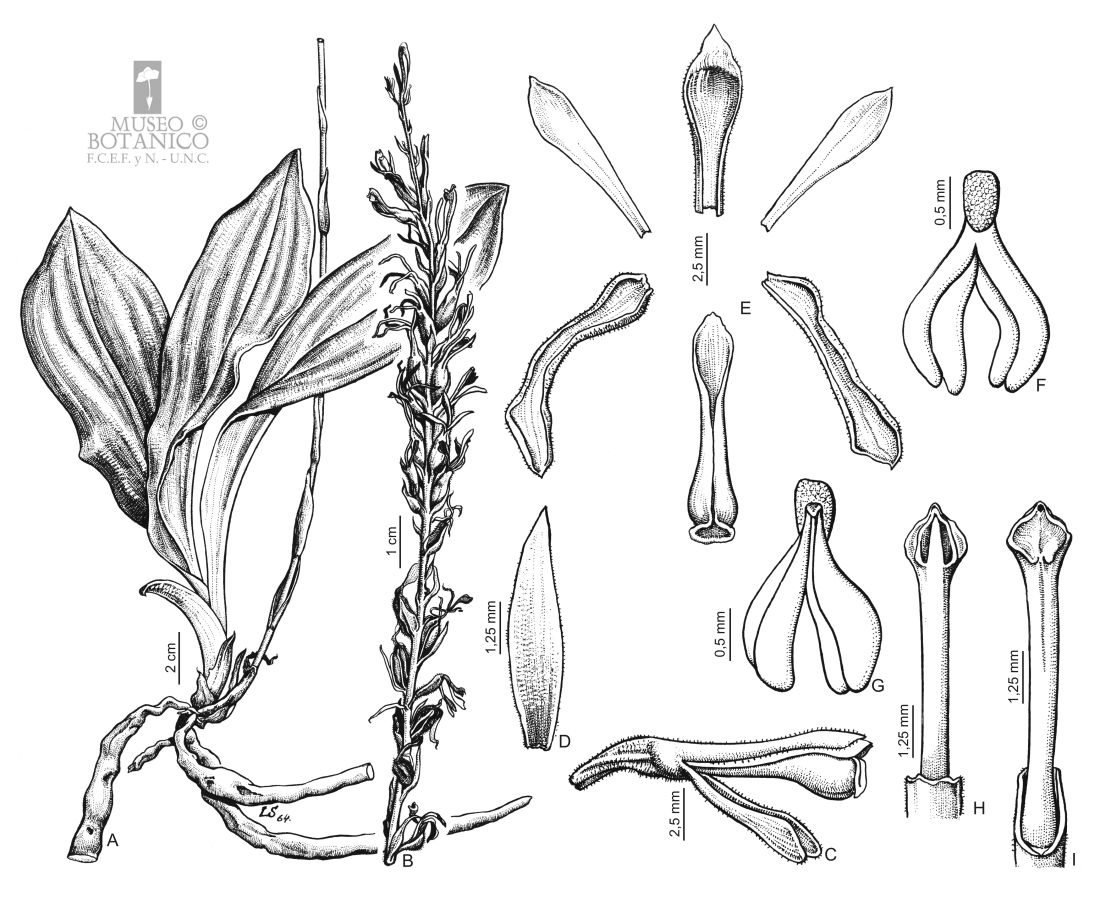 A. Planta completa. B. Inflorescencia. C. Flor, vista lateral. D. Bráctea de una flor. E. Perianto desplegado. F-G. Polinia, dos vistas. H-I. Columna mostrando el pie, vista del lado de la antera y del lado del estigma, respect.