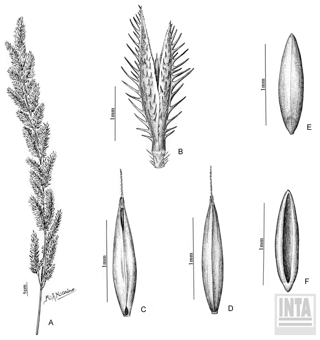 A, inflorescencia; B, espiguilla; C, antecio, vista ventral; D, antecio, vista dorsal; E, cariopsis, vista dorsal; F, cariopsis, vista ventral.