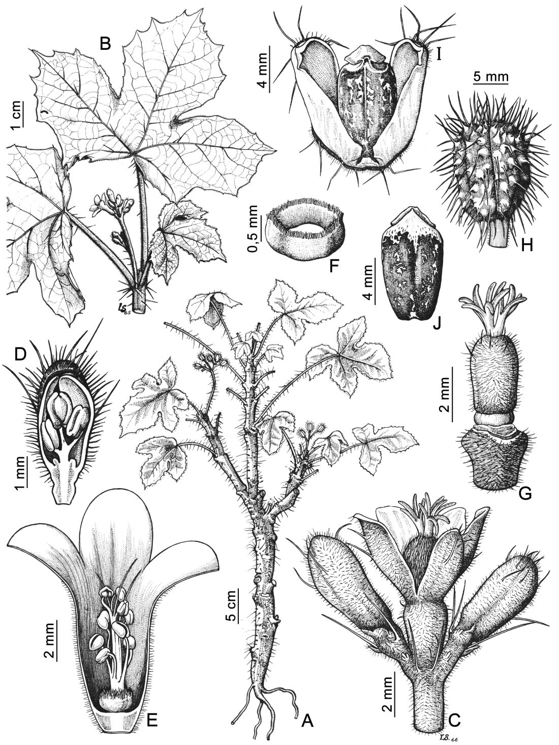 A. Planta. B. Rama florífera. C. Inflorescencia. D. Botón floral estaminado, corte longitudinal. E. Flor con parte del perianto removido. F. Nectario anular. G. Gineceo. H. Fruto indehiscente. I. Mericarpo dehiscente mostrando la semilla. J. Semilla.