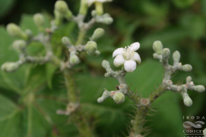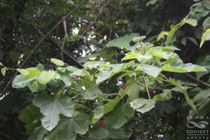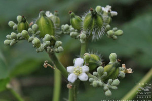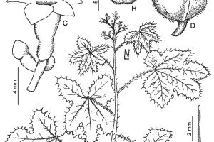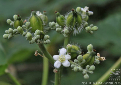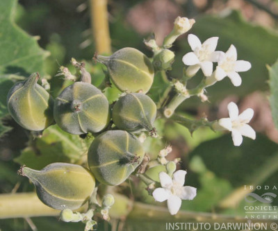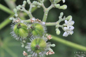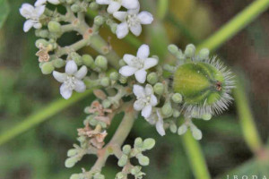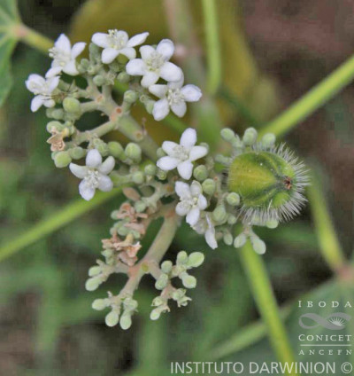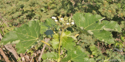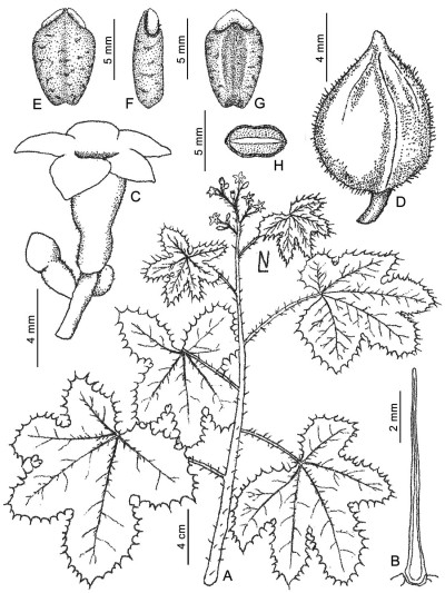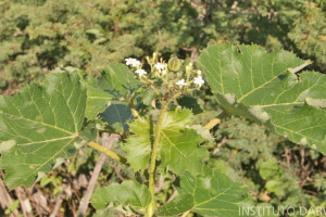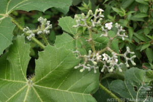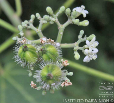 Arbusto o árbol hasta de 7 m de alto; ramas gruesas, las jóvenes tomentosas con setas urticantes. Hojas con pecíolos de 6-15 cm de largo, pubescentes, con setas urticantes y dos conjuntos de glándulas papiliformes en el ápice o a veces ausentes; estípulas lanceoladas, de 3-4 mm de largo, tomentosas, glanduloso-denticuladas; láminas de 5-19 × 6-21 cm, con 3-5 lóbulos cortos y de forma variada, sinuado-dentados (dientes espinescentes) y sub-lobados, pubescencia más notable en la cara abaxial, con o sin setas urticantes. Inflorescencias en cimas corimbiformes, multifloras; pedúnculos de 5-10 cm de largo, pubescentes, con setas urticantes; brácteas lanceoladas, de 3 mm de largo, pubescentes. Flor estaminada con cáliz tubuloso-campanulado, de 10-12 mm de largo, tomentoso, blanco, lóbulos soldados en dos tercios de su longitud, obtusos; disco 5-lobulado, glabro; columna estaminal pubescente; estambres 15, en tres verticilos; estaminodios 3-4, filiformes. Flor pistilada con 5 sépalos obovado-espatulados, ca. 12 mm de largo, tomentosos, blancos; disco irregularmente lobulado, glabro; estaminodios 8, cortos; ovario subcilíndrico, pubescente; estilos laciniados, estigmas aplanados. Fruto una cápsula ovoide o cónica, de 15-20 mm de largo, glabra o levemente pubescente, sin setas urticantes. Semillas elipsoides, de 10-12 × 6-7 mm, lisas, de color castaño; carúncula basalmente 2-lobada, de 2-3 × 5-6 mm, amarillo clara, notoria y prominente.