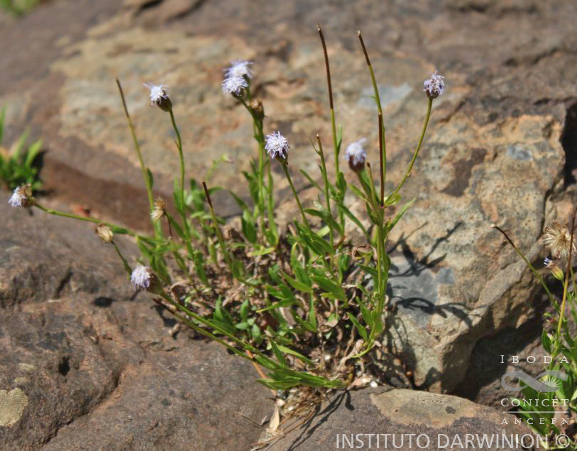 Hierbas anuales hasta de 60 cm de alto; tallos laxamente ramificados, pubérulos o glabérrimos. Hojas sésiles, láminas elípticas o lanceolado-elípticas, de 5-8 × 0,3-2 cm, atenuadas en la base, agudo-acuminadas en el ápice, remotamente dentadas en el margen, herbáceas, setosas o glabras. Capítulos pocos, muy largamente pedunculados, solitarios en las axilas de las hojas superiores y en los ápices de las ramas o reunidos en cimas paucicéfalas laxas. Involucro acampanado de 6-8 × 5-6 mm; filarios fácilmente caedizos, en 3-4 series, lanceolados, glabros. Flores numerosas, corolas rosadas o purpúreas, ca. 7,5 mm de largo. Aquenios ca. 2 mm de largo, negros, con pelos en las costillas. Papus blancuzco.