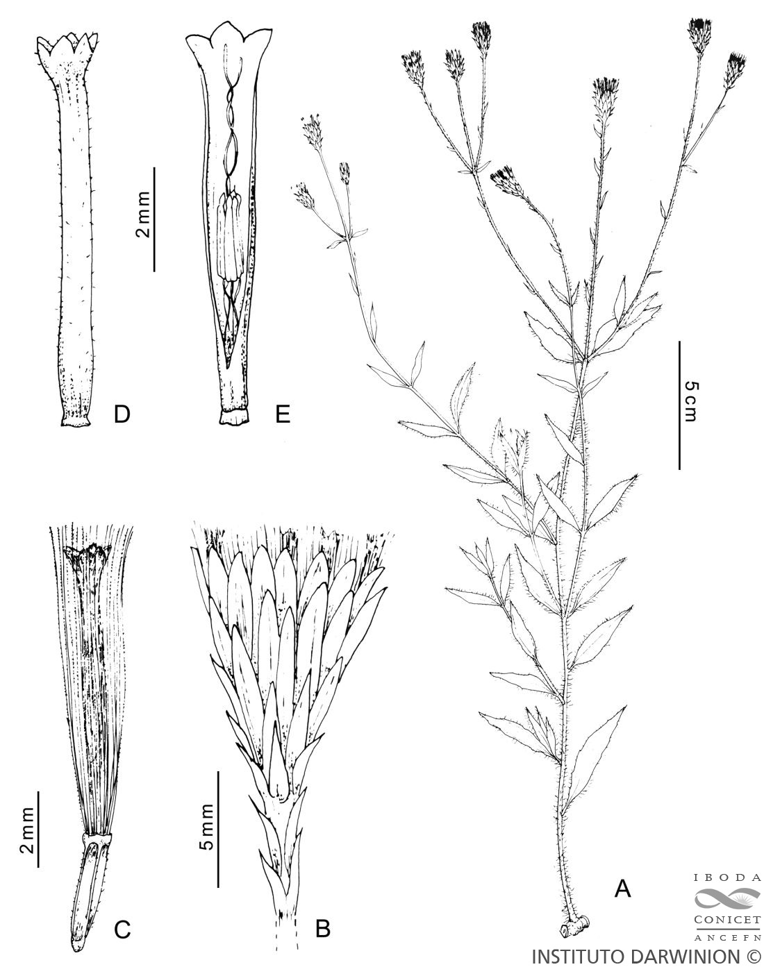 A. Rama florífera. B. Capítulo. C. Flor. D. Corola. E. Corola, vista interior mostrando las anteras y el estilo. Tomado de Fl. Paraguay 25: 91, fig. 31. 1996.