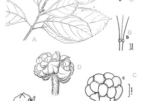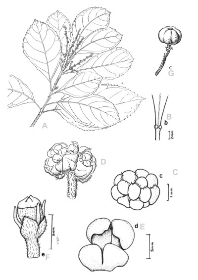 Árboles de 5-8(-20) m de alto. Hojas con pecíolo acanalado de (1-)2-4 cm de largo, con 2 glándulas ubicadas en el límite entre el ápice del pecíolo y la base de la lámina; láminas elípticas, de (9-)10-15(-20) × 3-7(-10) cm, cartáceas, ápice acuminado, el margen entero o aserrado, con glándulas sésiles dispersas, en ocasiones eglandulares. Inflorescencias estaminadas solitarias, en espigas o panículas, de 6-9(-21) cm de largo; flores en glomérulos sésiles, 5-12 por nudo, con sépalos ovados de 1-1,5 × 0,8-1,5 mm, pubescentes a glabrescentes o glabros; androceo 3-mero, pistilodio diminuto. Inflorescencias pistiladas en racimos de 2-6 cm de largo, brevemente pedunculadas; flores pediceladas de 1-3(-4) mm de largo, con sépalos ovados de 1-1,7 × 1,2-1,4 mm, glabros a hirsutos en la cara dorsal; ovario glabro o piloso, 2-3-carpelar. Fruto una cápsula de 2-3 mm de largo, pedicelada, 2-3-lobulada, deprimida, a veces redondeada, de 0,5-0,7 × 0,5-1 cm. Semillas de 4-6,5 × 4-5 × 2,5-3 mm.