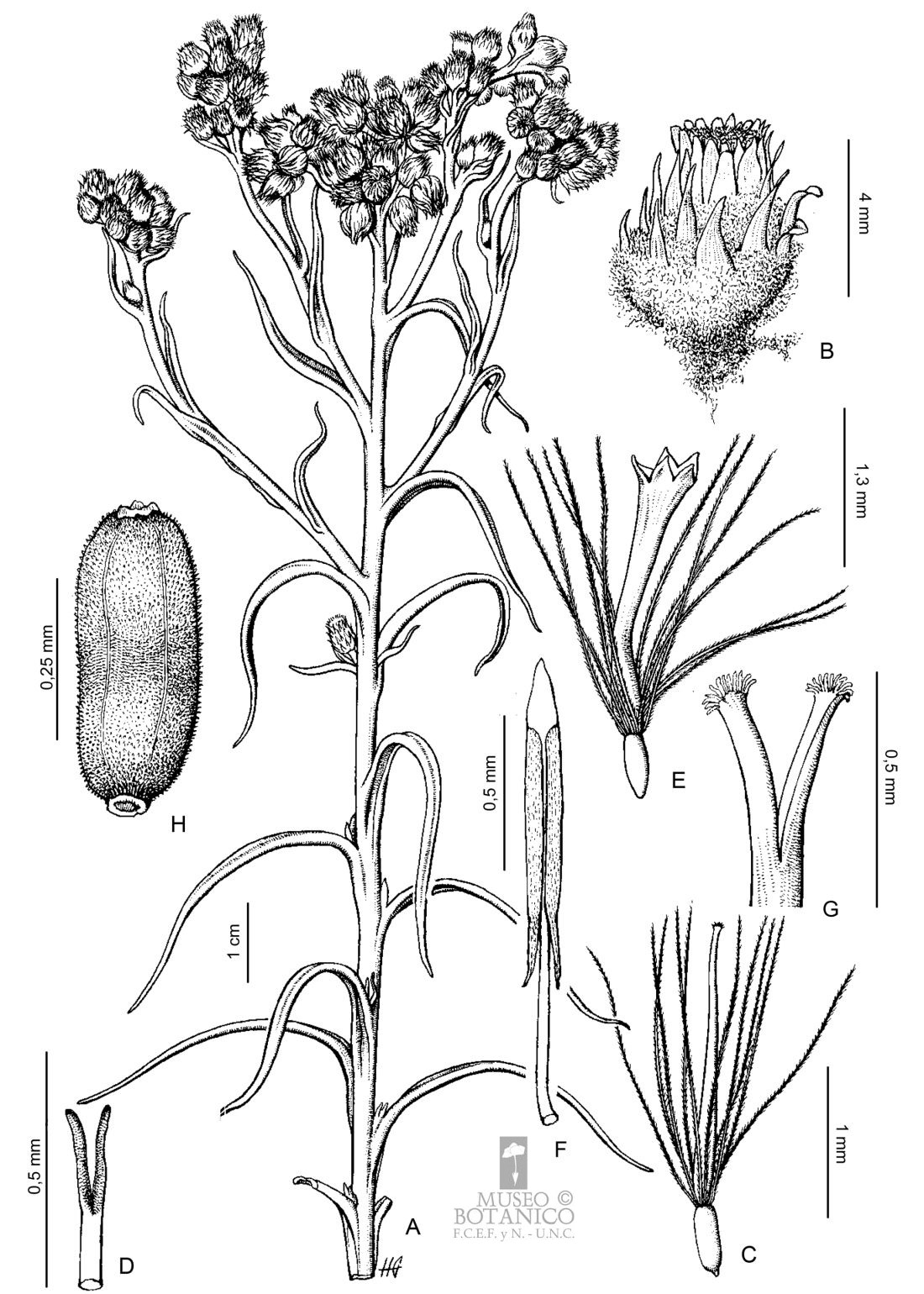 A. Rama florífera. B. Capítulo. C. Flor del margen. D. Parte superior del estilo de una flor marginal. E. Flor del centro. F. Antera. G. Parte superior del estilo de una flor central. H. Aquenio.