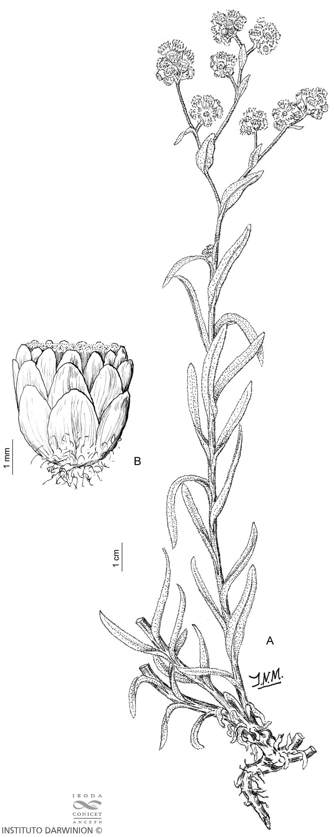 Hierbas probablemente perennes, multicaules, de 15-50 cm de alto; tallos ascendentes, o bien erectos en plantas mayores, simples o ramificados en la parte superior, laxamente lanosos, hojosos hasta la inflorescencia. Hojas de 2-7 cm × 2-6 mm, las inferiores linear-obovadas, las superiores linear-lanceoladas, atenuadas en la parte superior, decurrentes en la base, agudas y mucronadas en el ápice, enteras, laxamente tomentosas, a veces glabrescentes en la haz. Capítulos numerosos, dispuestos en glomérulos reunidos en cimas corimbiformes densas. Involucro acampanado, de 3-4 × 3-4; filarios en 4 series, citrinos, raramente pardos, los exteriores anchamente ovados, ca. 4 × 1,5 mm, obtusos a redondeados en el ápice, los interiores oblongos y redondeados a subagudos en el ápice. Flores marginales ca. 120, corolas de 2,3-2,5 mm de largo; flores del centro 6-8, corolas de 2,2-2,5 mm de largo. Aquenios ca. 0,8 mm de largo, glabros, epidermis papilosa. Papus de 2,5-2,8 mm de largo.