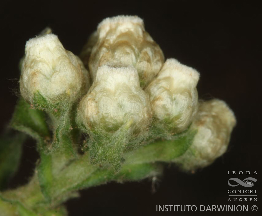 Hierbas perennes, pigmeas, cespitosas, multicaules; tallos tendidos, simples o poco ramificados, de 2-12 cm de largo, densamente albo-tomentosos. Hojas alternas, las superiores amontonadas en el ápice de las ramas, las basales más o menos arrosetadas, espatuladas, de 10-15(-20) × 2-3 (-5) mm, atenuadas en la base, redondeadas en el ápice, margen plano, concoloras, gríseo-lanosas en ambas caras, con pelos flageliformes y pelos glandulares, escasos, cortos, ocultos por la lanosidad. Capítulos pocos, sésiles, en la axila de las hojas superiores, formando glomérulos y rodeados por las hojas superiores. Involucro anchamente acampanado, de 4,5-5 × 5 mm; filarios en 4-5 series, de color blanco lechoso o blanco pardo, con amplio margen hialino, los exteriores anchamente elípticos, de 4 × 2-2,7 mm, obtusos en el ápice y lanuginosos en el dorso, los interiores oblongo-lanceolados, de 4-4,6 × 0,7-1 mm, semiobtusos a redondeados en el ápice y glabros. Flores marginales 42-126, corolas de 2,5-3,8 mm de largo; flores del centro 8-20, corolas de 2,5-3,7 mm de largo. Aquenios de 0,4-1 mm de largo, glabros, epidermis lisa a papilosa. Papus blanco de 3-3,2 mm de largo.