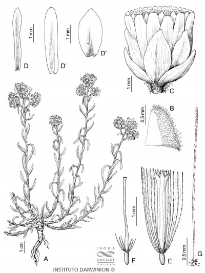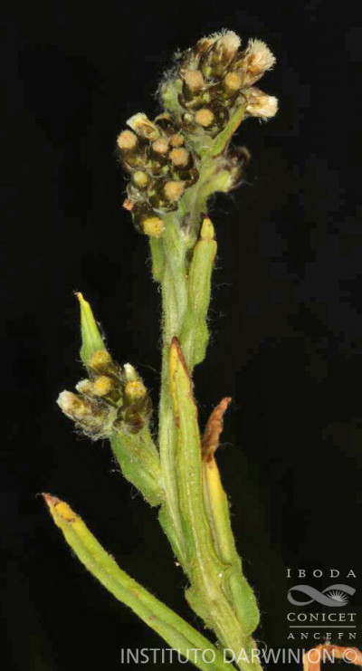 Hierbas probablemente perennes de (5)10-85 cm de alto, multicaules, raro tallos solitarios; tallos erectos o ascendentes, simples o cortamente ramificados en la parte superior, glandulosos y algo lanosos en la parte superior, hojosos hasta cerca de la inflorescencia. Hojas basales oblanceoladas de 85–90 × 4–8 mm y las caulinares lineares, de 3-6,5 cm × 1-6 mm, decurrentes en la base, atenuadas y agudas en el ápice, margen plano, ligeramente revoluto, concoloras, gladulosas o aracnoideo-glandulosas en ambas caras, a veces algo lanuginosas en la inferior, con pelos glandulares y escasísimos pelos flageliformes. Capítulos numerosos, dispuestos en glomérulos apicales, agrupados en cimas paniculiformes o corimbiformes. Involucro globoso, 4-5 × 4-5 mm; filarios en 3-4 series, de color pajizo o pardo, subobtusos, los exteriores ovados, de 4,5-5 × 1,8-2,6 mm, los interiores oblongos, de 3,7-4,5 × 0,6-1,7 mm. Flores marginales (46-)82-143, corolas de 2,5-3 mm de largo; flores del centro 5-14, corolas de 3- 3,2 mm de largo. Aquenios de 0,5-1 mm de largo, glabros, epidermis lisa a papilosa. Papus de 2,5-3,4 mm de largo.