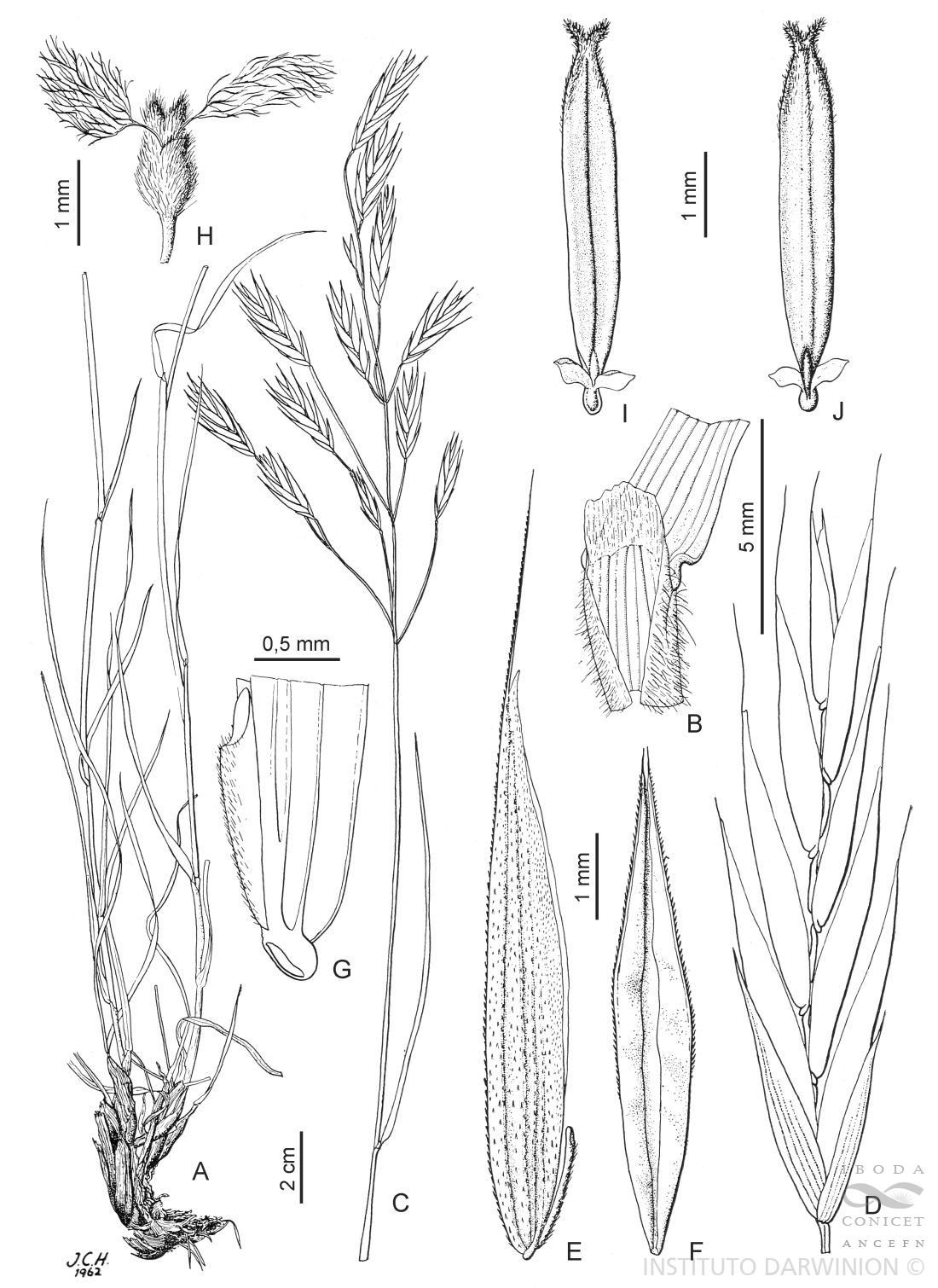 A. Porción basal de la planta. B. Región ligular. C. Caña florífera. D. Espiguilla. E. Antecio, vista lateral. F. Pálea. G. Detalle de la porción basal de un antecio y raquilla. H. Gineceo. I. Cariopsis, vista hilar y parte de las lodículas. J. Cariopsis, vista escutelar y parte de las lodículas.