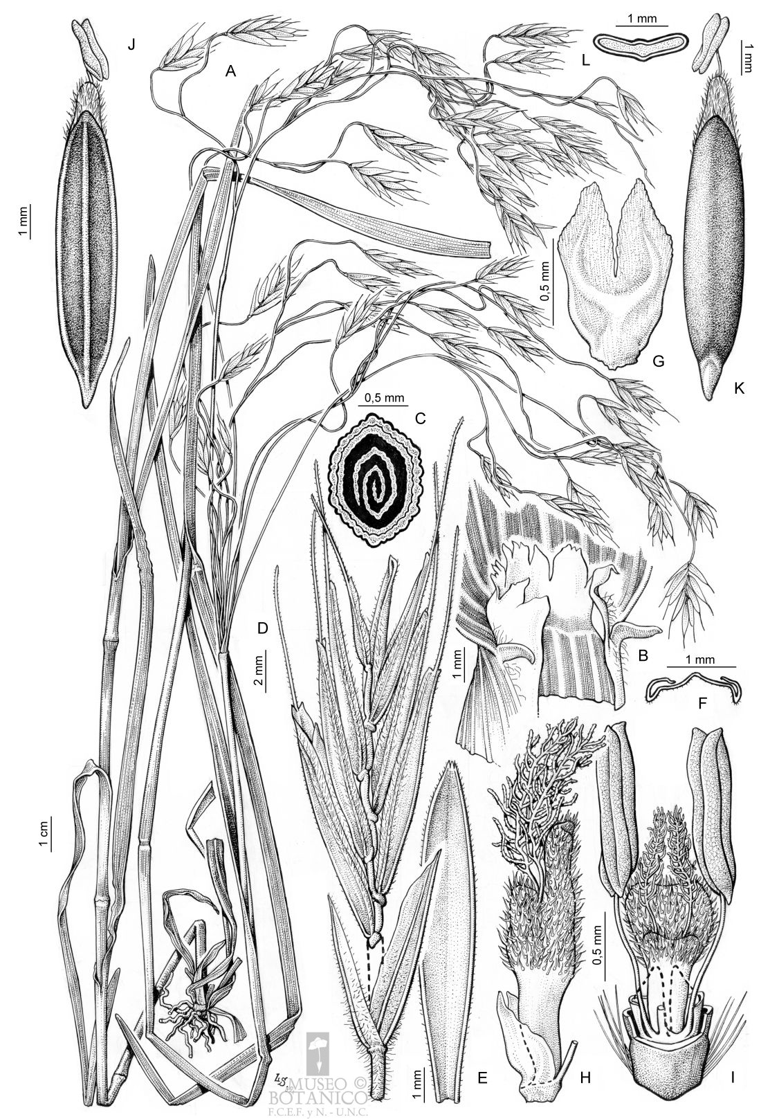 A. Planta. B. Región ligular. C. Prefoliación. D. Espiguilla con glumas separado abajo, mostrando donde se produce la articulación. E. Pálea. F. Transcorte de pálea. G. Lodículas. H. Ovario y lodículas en vista lateral. I. Flor perfecta. J. Cariopsis, vista hilar. K. Cariopsis, vista escutelar. L. Cariopsis, transcorte.