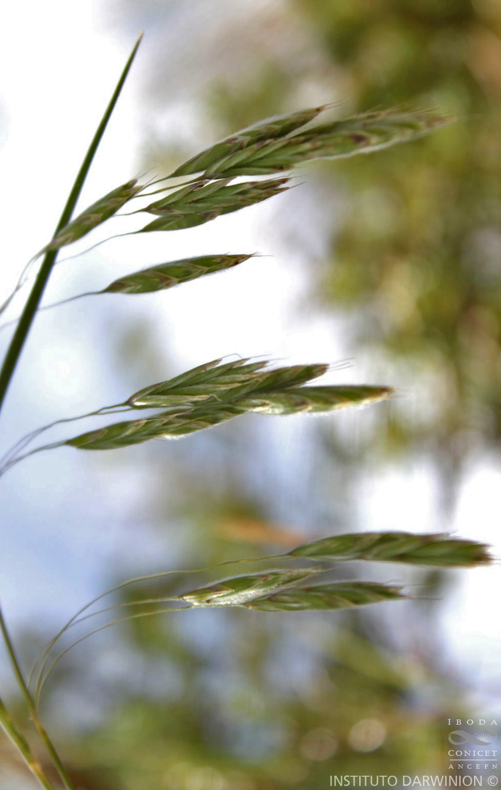Plantas perennes, cespitosas; cañas erguidas, de 50-110 cm de alto, con macollas intravaginales; nudos 2-4, glabros; vainas retrorso escabrosas o pubescentes, de prefolia¬ción convoluta; lígulas membranáceas, de 1,5-2,5 mm de largo, dentadas en el ápice; láminas lineales, de 10-45 x 0,4-0,8 cm, planas, con la cara adaxial provista de pelos largos ralos y la abaxial glabra o escabrosa. Inflorescencia en panoja laxa, de 15-25 cm de largo, ramificada o paupérrima, raquis y pedicelos pilosos o escabrosos, ramas flexuosas y onduladas, a veces con tintes violáceos. Espiguillas poco comprimidas lateralmente, de (14-)16-25 x 4-8 mm, 6-8 floras, con antecios poco imbricados los que a la madurez se separan y dejan ver la raquilla pilosa; glumas desiguales, persistentes, pilosas, escabrosas o subglabras, normalmente con tintes violáceos hacia los bordes y ápice, mayores de la mitad del largo de la lemma contigua, gluma inferior membranácea, angostamente triangular, de 6-10(-11) mm de largo, 1-nervia, gluma superior membranácea, aovado-lanceolada, de 8-12(-13) mm de largo, 3-nervia, levemente aris¬tulada en el ápice; lemma del antecio basal aovada o lanceolada, de ápice bilobulado (lóbulos menores a 1 mm de largo), de 9-13(-15) mm de largo, 7-nervia, escabrosa o pilosa en el dorso y villosa en los márgenes, con arista subapical, flexuosa, de 5-8 mm de largo, a veces con tintes violáceos, naciendo a menos de 1,5 mm del ápice; pálea del antecio basal membranácea, hialina, escabrosa en el dorso, un poco menor que su lemma, de 7-9 mm de largo; estambres 3, anteras de 2-3 mm de largo; cariopsis elipsoide, aplanada, con surco ventral, hilo lineal tan largo como la cariopsis.