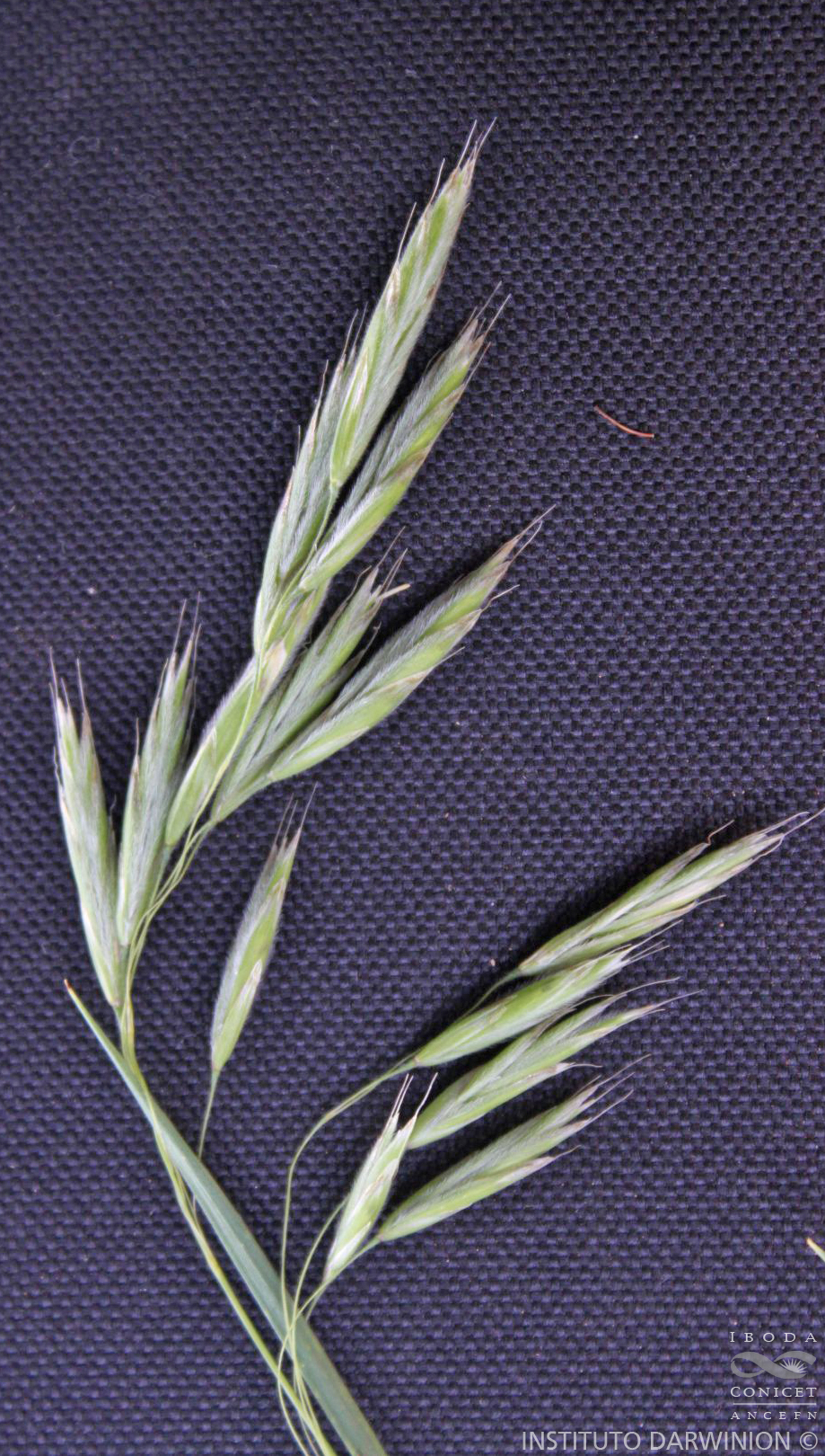 Plantas perennes, cespitosas; cañas erguidas, de 50-110 cm de alto, con macollas intravaginales; nudos 2-4, glabros; vainas retrorso escabrosas o pubescentes, de prefolia¬ción convoluta; lígulas membranáceas, de 1,5-2,5 mm de largo, dentadas en el ápice; láminas lineales, de 10-45 x 0,4-0,8 cm, planas, con la cara adaxial provista de pelos largos ralos y la abaxial glabra o escabrosa. Inflorescencia en panoja laxa, de 15-25 cm de largo, ramificada o paupérrima, raquis y pedicelos pilosos o escabrosos, ramas flexuosas y onduladas, a veces con tintes violáceos. Espiguillas poco comprimidas lateralmente, de (14-)16-25 x 4-8 mm, 6-8 floras, con antecios poco imbricados los que a la madurez se separan y dejan ver la raquilla pilosa; glumas desiguales, persistentes, pilosas, escabrosas o subglabras, normalmente con tintes violáceos hacia los bordes y ápice, mayores de la mitad del largo de la lemma contigua, gluma inferior membranácea, angostamente triangular, de 6-10(-11) mm de largo, 1-nervia, gluma superior membranácea, aovado-lanceolada, de 8-12(-13) mm de largo, 3-nervia, levemente aris¬tulada en el ápice; lemma del antecio basal aovada o lanceolada, de ápice bilobulado (lóbulos menores a 1 mm de largo), de 9-13(-15) mm de largo, 7-nervia, escabrosa o pilosa en el dorso y villosa en los márgenes, con arista subapical, flexuosa, de 5-8 mm de largo, a veces con tintes violáceos, naciendo a menos de 1,5 mm del ápice; pálea del antecio basal membranácea, hialina, escabrosa en el dorso, un poco menor que su lemma, de 7-9 mm de largo; estambres 3, anteras de 2-3 mm de largo; cariopsis elipsoide, aplanada, con surco ventral, hilo lineal tan largo como la cariopsis.