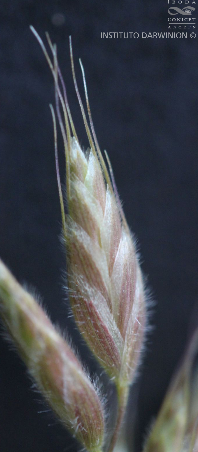 Plantas anuales; cañas erguidas o procumbentes, de 10-75 cm de alto, poco macollada; nudos 2-5, glabros o con pelos ralos; vainas inferiores pubescentes, apenas abiertas en su parte superior, de 1,5-7 mm de largo; lígulas membranáceas, de 2-3 mm de largo, dentadas en el ápice; láminas lineales, planas, de 3-15 x 0,2-0,5 cm, pubescentes. Inflorescencia en panoja densa, de 3-12 cm de largo, contraída (con pocas espiguillas agrupadas en el extremo de ramificaciones cortas y rectas, de 0,5-1,5 cm de largo); pedicelos de 0,3-1 cm de largo. Espiguillas oval-lanceoladas, poco comprimidas lateralmente, pubescentes, de (10-)15-17(-22) x 4-6(-7) mm, 6-12 floras; glumas desiguales, persistentes, pubescentes, por lo general mayores a la mitad del largo de la lemma contigua, gluma inferior membranácea, aovado-oblonga, de 5-7 mm de largo, 3-5 nervia, gluma superior membranácea, elíptica, de 6,5-9 mm de largo, 5-7 nervia; lemma del antecio basal ovoide, de dorso redondeado y ápice bilobulado (lóbulos de 1-2 mm de largo), de 7,5-9 mm de largo, 7-9 nervia, pubescente, con arista subapical, recta, no retorcida, de 3-8 mm de largo, naciendo a menos de 1,5 mm del ápice; pálea del antecio basal menor que el largo de su lemma, de 5-7 mm de largo, generalmente ciliada en el tercio superior; estambres 3, anteras de 1-2 mm de largo; cariopsis de 6-7 mm de largo.