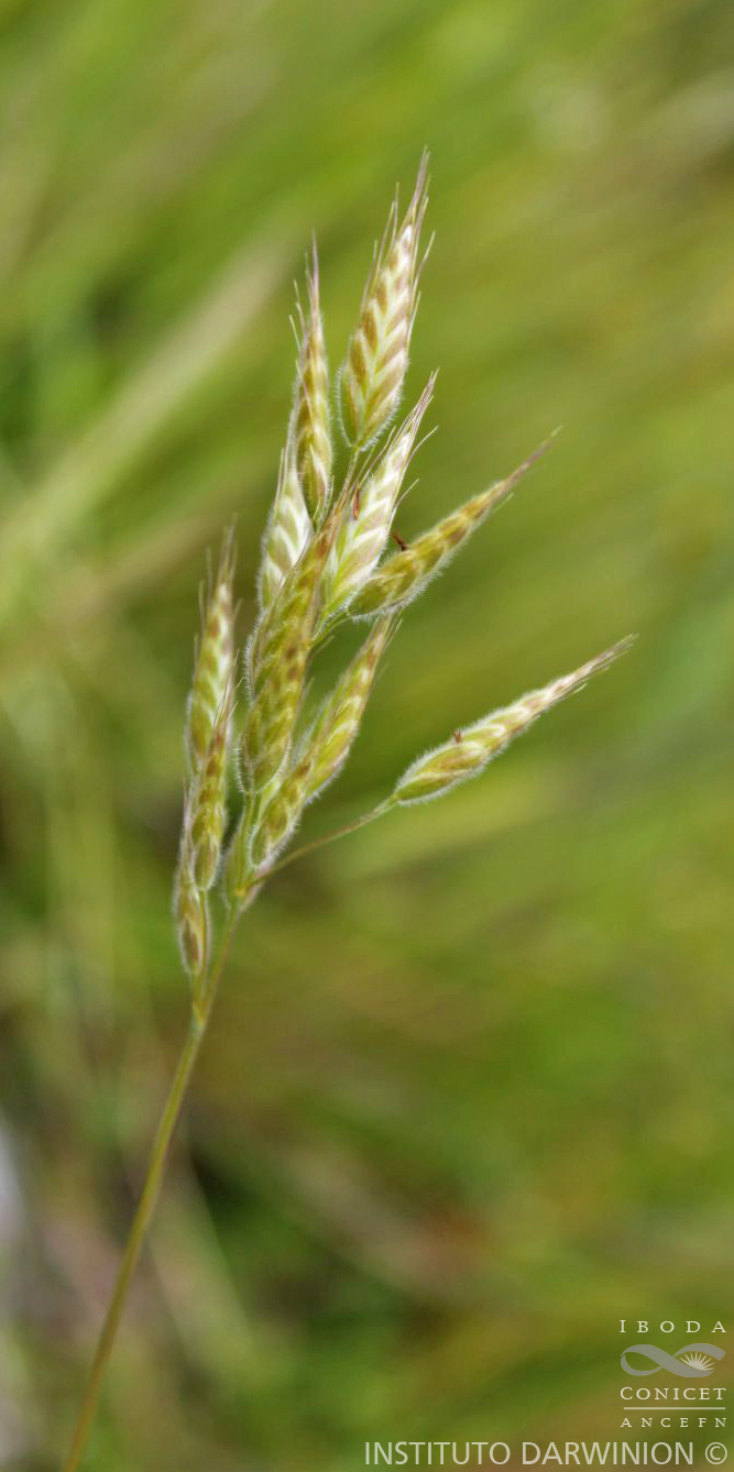 Plantas anuales; cañas erguidas o procumbentes, de 10-75 cm de alto, poco macollada; nudos 2-5, glabros o con pelos ralos; vainas inferiores pubescentes, apenas abiertas en su parte superior, de 1,5-7 mm de largo; lígulas membranáceas, de 2-3 mm de largo, dentadas en el ápice; láminas lineales, planas, de 3-15 x 0,2-0,5 cm, pubescentes. Inflorescencia en panoja densa, de 3-12 cm de largo, contraída (con pocas espiguillas agrupadas en el extremo de ramificaciones cortas y rectas, de 0,5-1,5 cm de largo); pedicelos de 0,3-1 cm de largo. Espiguillas oval-lanceoladas, poco comprimidas lateralmente, pubescentes, de (10-)15-17(-22) x 4-6(-7) mm, 6-12 floras; glumas desiguales, persistentes, pubescentes, por lo general mayores a la mitad del largo de la lemma contigua, gluma inferior membranácea, aovado-oblonga, de 5-7 mm de largo, 3-5 nervia, gluma superior membranácea, elíptica, de 6,5-9 mm de largo, 5-7 nervia; lemma del antecio basal ovoide, de dorso redondeado y ápice bilobulado (lóbulos de 1-2 mm de largo), de 7,5-9 mm de largo, 7-9 nervia, pubescente, con arista subapical, recta, no retorcida, de 3-8 mm de largo, naciendo a menos de 1,5 mm del ápice; pálea del antecio basal menor que el largo de su lemma, de 5-7 mm de largo, generalmente ciliada en el tercio superior; estambres 3, anteras de 1-2 mm de largo; cariopsis de 6-7 mm de largo.
