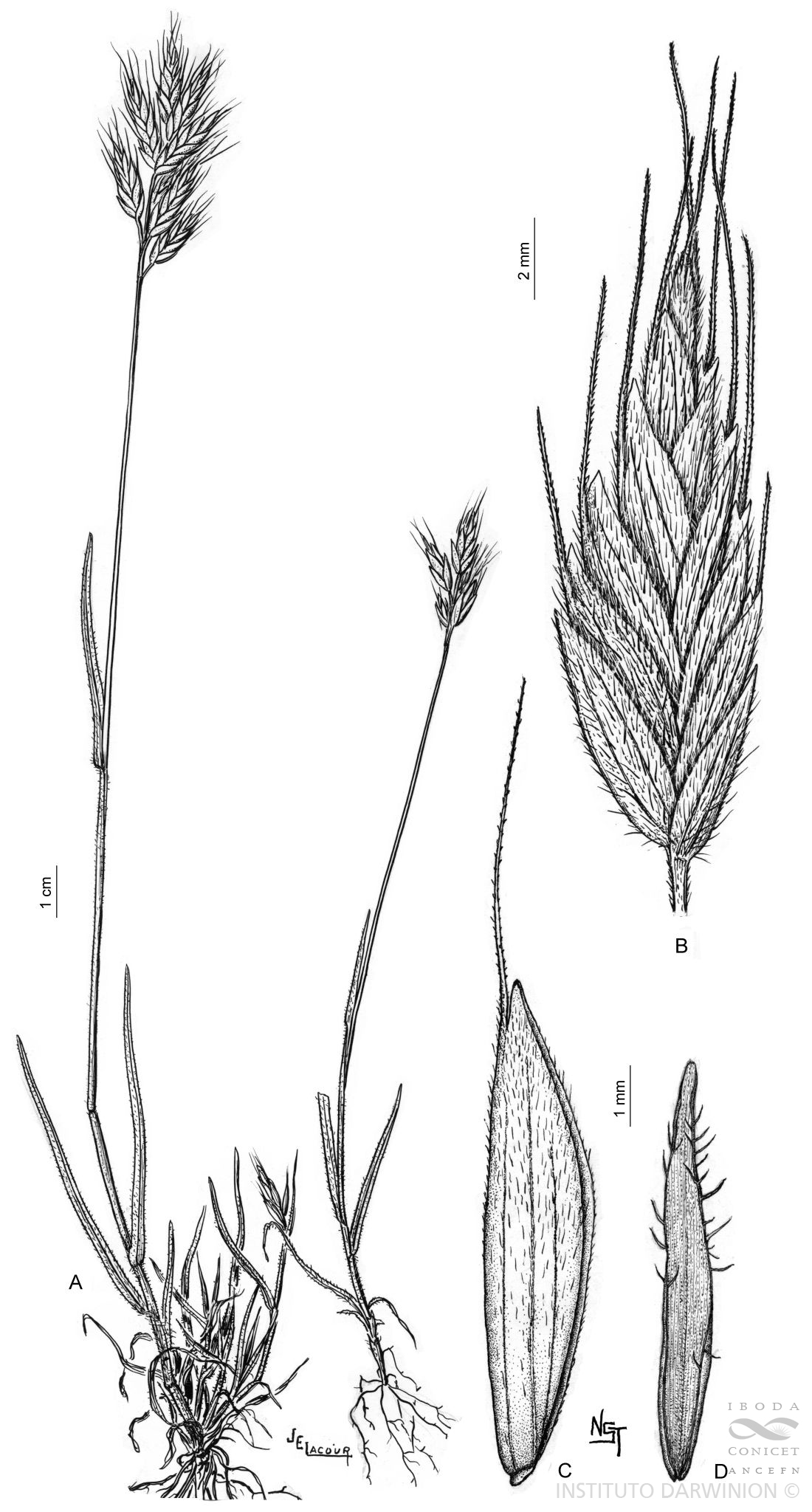 Plantas anuales; cañas erguidas o procumbentes, de 10-75 cm de alto, poco macollada; nudos 2-5, glabros o con pelos ralos; vainas inferiores pubescentes, apenas abiertas en su parte superior, de 1,5-7 mm de largo; lígulas membranáceas, de 2-3 mm de largo, dentadas en el ápice; láminas lineales, planas, de 3-15 x 0,2-0,5 cm, pubescentes. Inflorescencia en panoja densa, de 3-12 cm de largo, contraída (con pocas espiguillas agrupadas en el extremo de ramificaciones cortas y rectas, de 0,5-1,5 cm de largo); pedicelos de 0,3-1 cm de largo. Espiguillas oval-lanceoladas, poco comprimidas lateralmente, pubescentes, de (10-)15-17(-22) x 4-6(-7) mm, 6-12 floras; glumas desiguales, persistentes, pubescentes, por lo general mayores a la mitad del largo de la lemma contigua, gluma inferior membranácea, aovado-oblonga, de 5-7 mm de largo, 3-5 nervia, gluma superior membranácea, elíptica, de 6,5-9 mm de largo, 5-7 nervia; lemma del antecio basal ovoide, de dorso redondeado y ápice bilobulado (lóbulos de 1-2 mm de largo), de 7,5-9 mm de largo, 7-9 nervia, pubescente, con arista subapical, recta, no retorcida, de 3-8 mm de largo, naciendo a menos de 1,5 mm del ápice; pálea del antecio basal menor que el largo de su lemma, de 5-7 mm de largo, generalmente ciliada en el tercio superior; estambres 3, anteras de 1-2 mm de largo; cariopsis de 6-7 mm de largo.