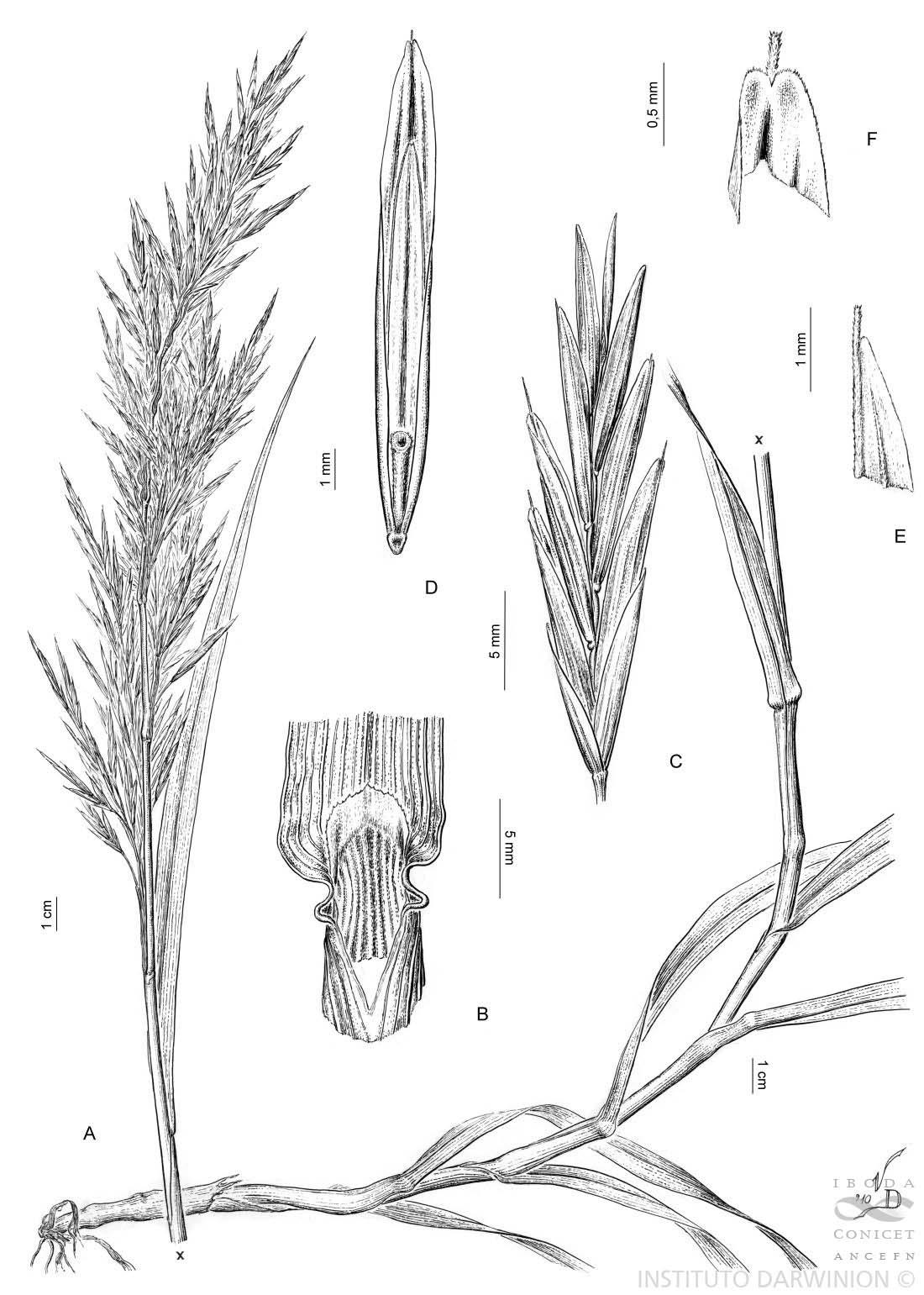 A. Planta. B. Región ligular. C. Espiguilla. D. Antecio basal visto por la pálea. E-F. Ápice de la lemma.
