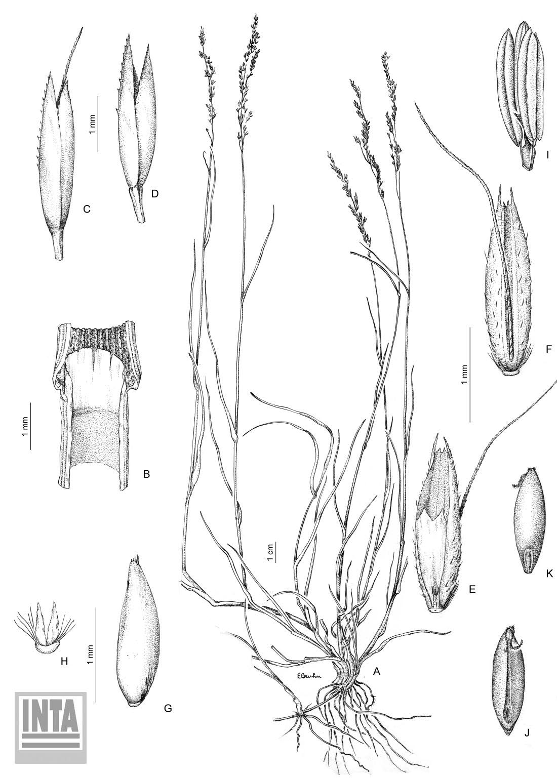A. Planta. B. Región ligular. C. Espiguilla con antecio aristado. D. Espiguilla con antecio mútico. E. Antecio aristulado, vista ventral mostrando la pálea y la raquilla. F. Antecio aristulado, vista dorsal. G. Antecio mucronado. H. Lodículas. I. Estambres. J. Cariopsis, vista hilar. K. Cariopsis, vista escutelar.